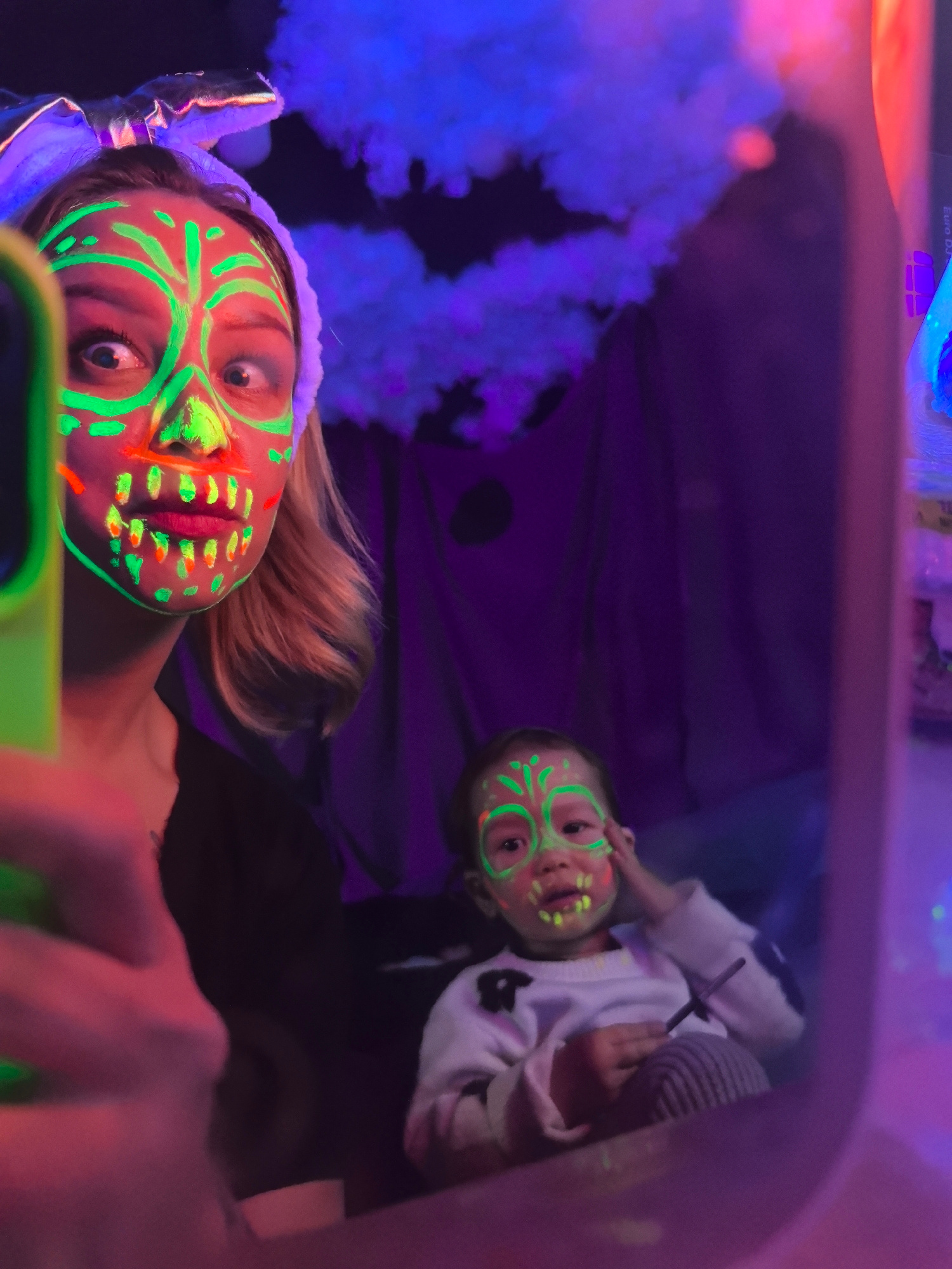 A woman and a toddler are seen in a mirror selfie. Both have green neon face paint; the woman has rabbit ears. The woman is holding a cell phone to take the photo. The toddler sits in the background i…read more