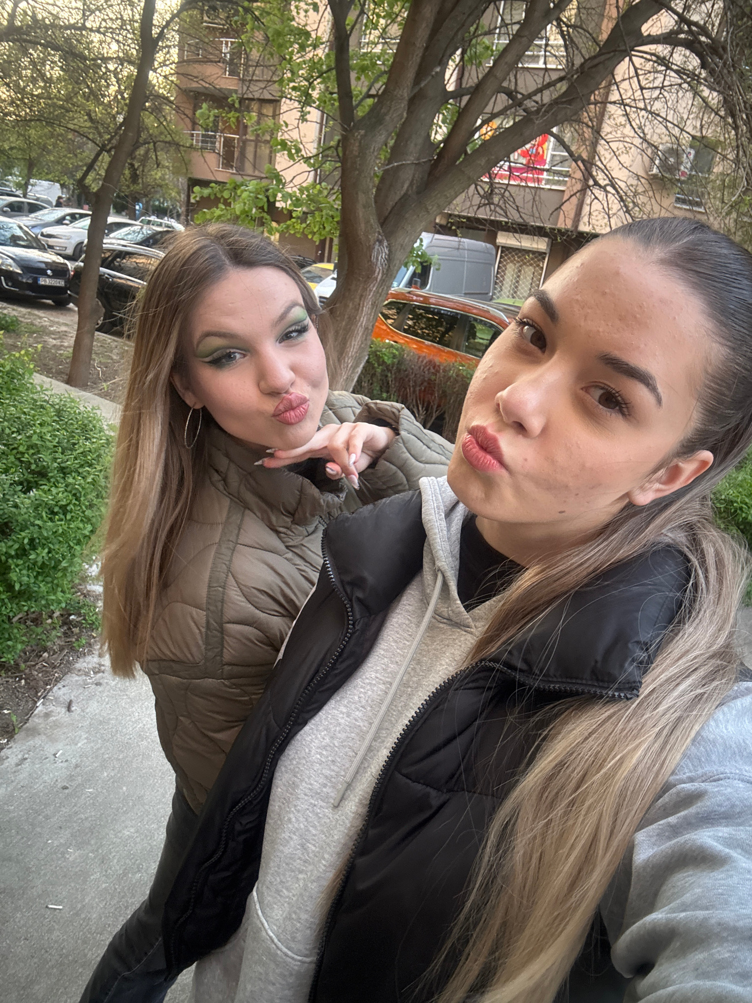Two young women pose for a selfie outdoors. The upper woman has dark hair pulled back, a black vest over a gray hooded sweatshirt, and a neutral expression. The lower woman has shoulder-length light b…read more