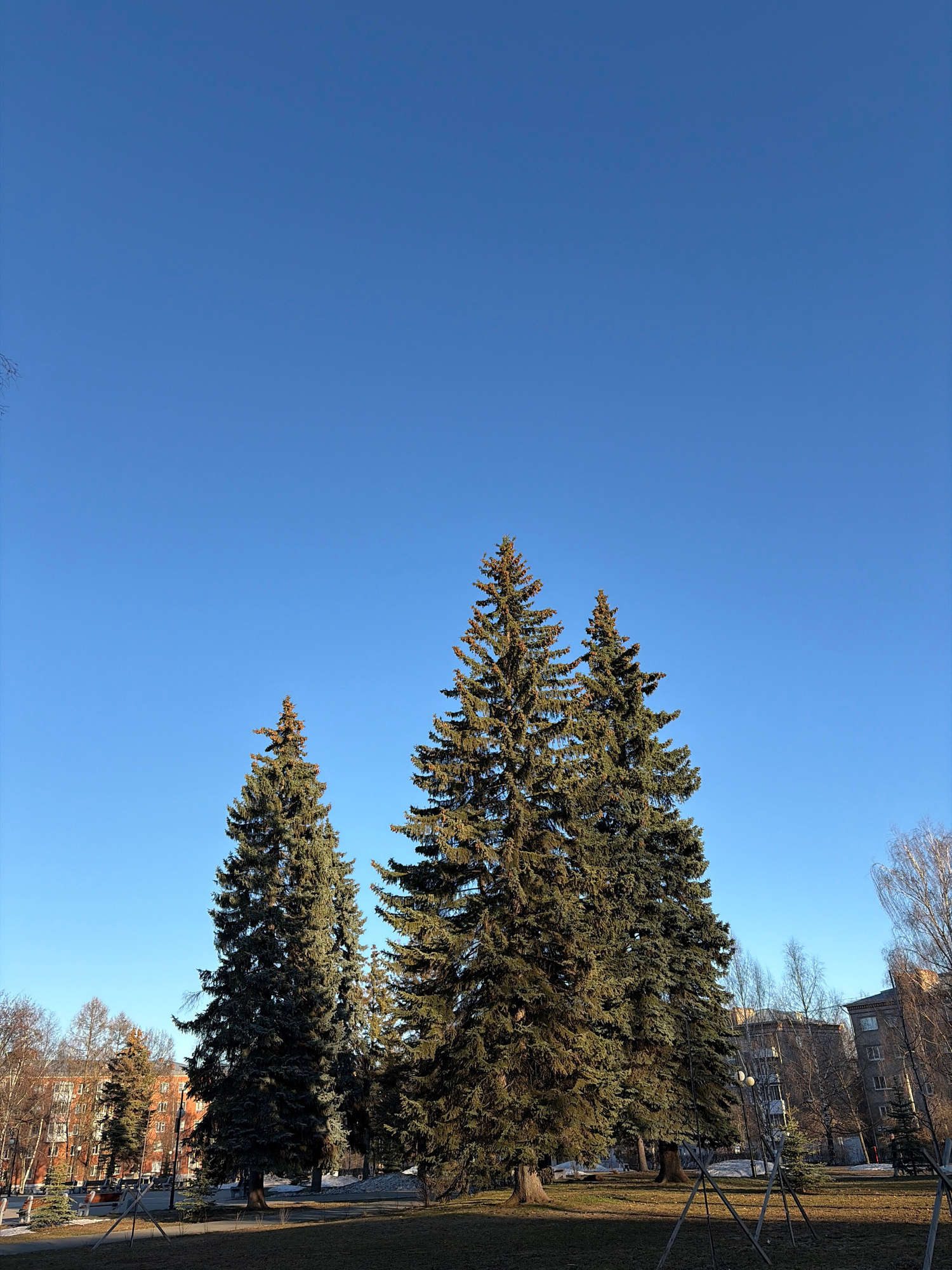 The image shows a clear blue sky above two large evergreen trees. Buildings are visible in the background, and the trees appear to be located in a park or green space. Based on the available informati…read more