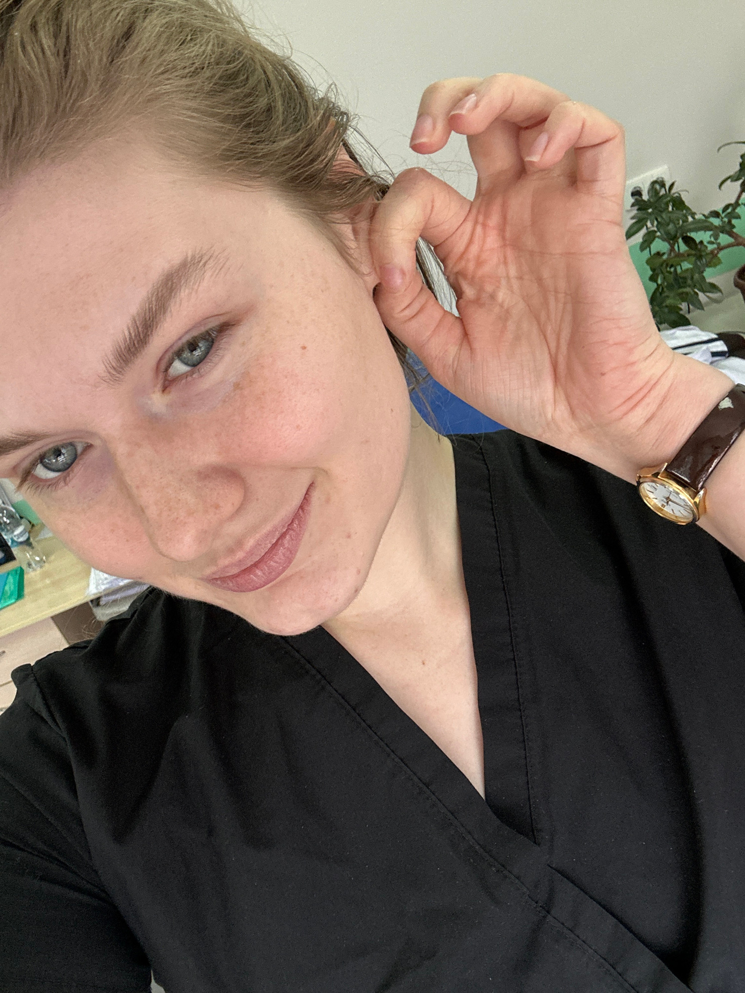 A close-up, selfie-style photograph shows a person with fair skin, freckles, light brown hair, and blue eyes. They are wearing a black collared shirt. The person's left hand is raised near their left…read more