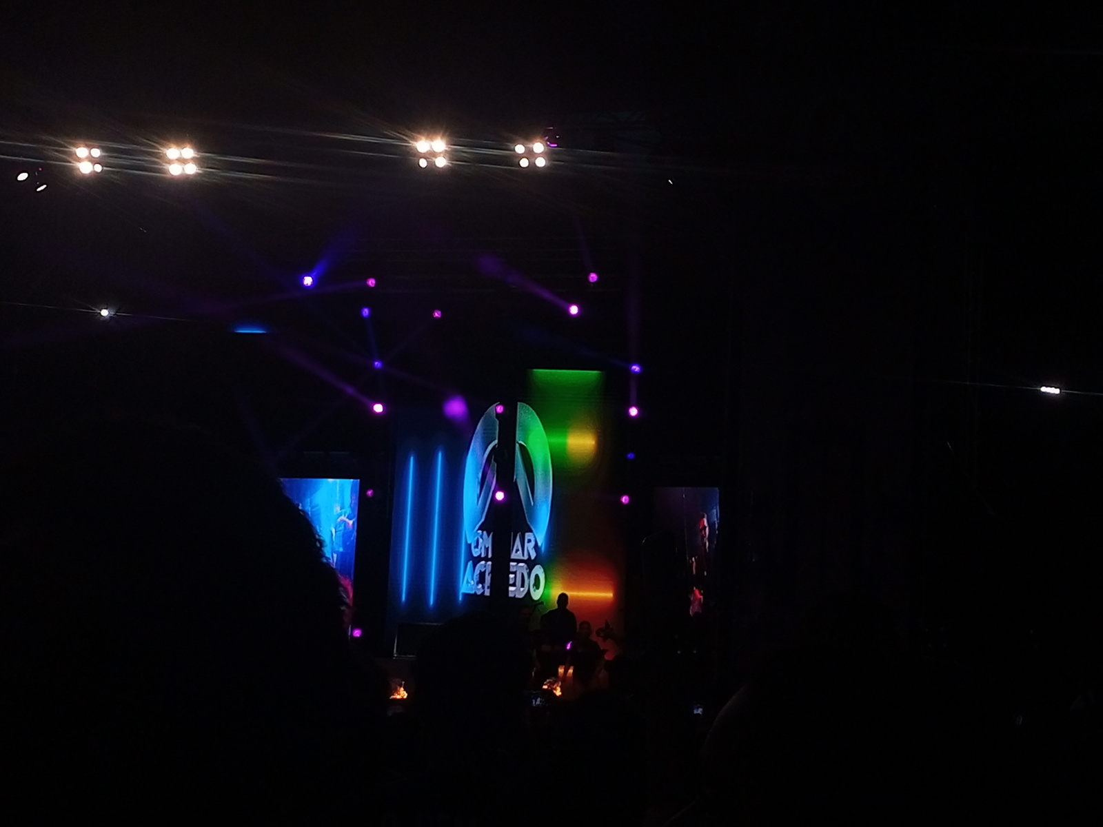 The image depicts a concert or event taking place at night, likely indoors given the controlled lighting. In the background, there is a stage with a large screen displaying the name "OMAR ACEVEDO" alo…read more