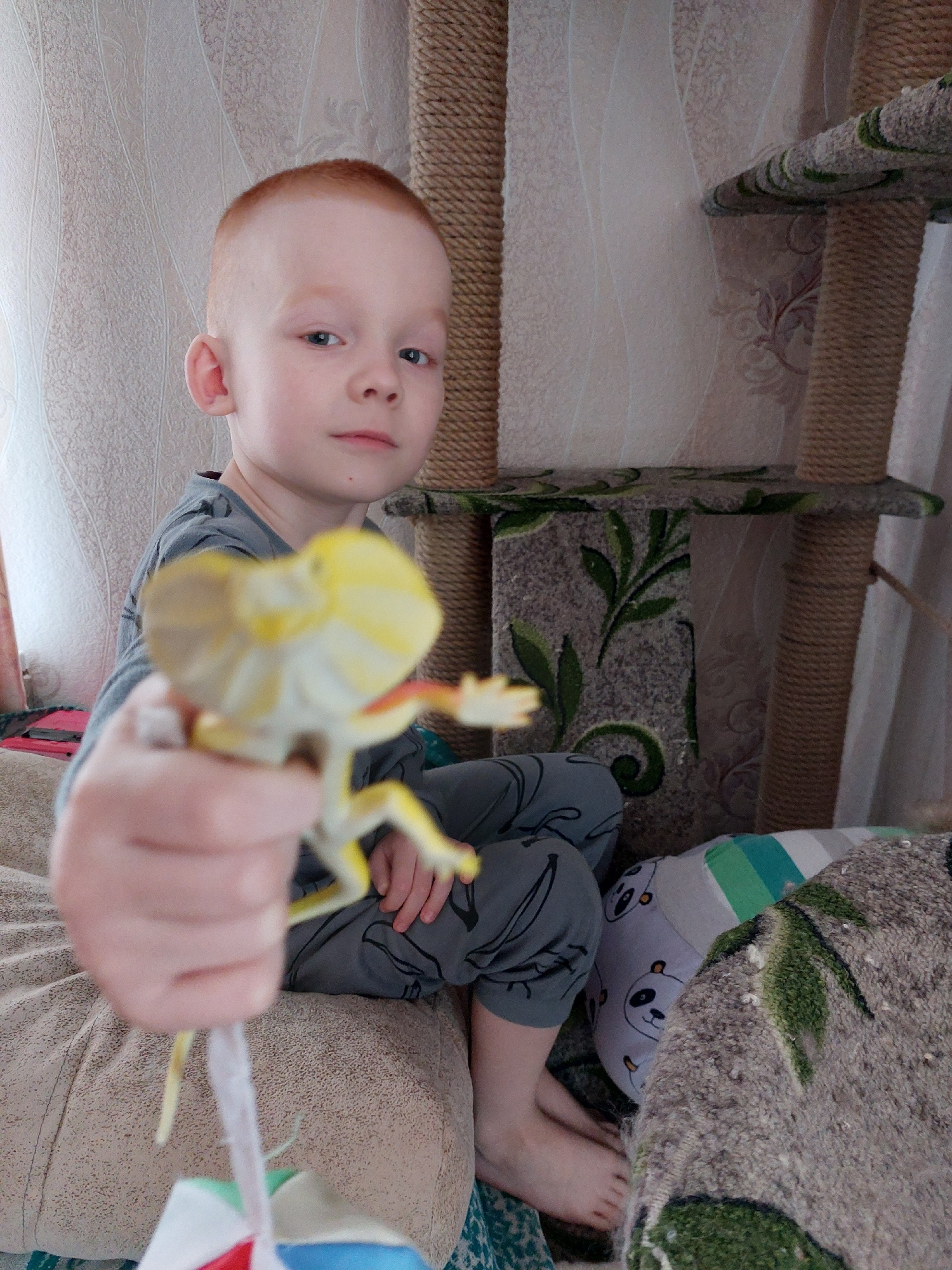 A ginger-haired child is holding a toy chameleon in a child's room. The child is wearing gray pants and lying on a couch. The room appears to be located in Большой Букор, Russia.