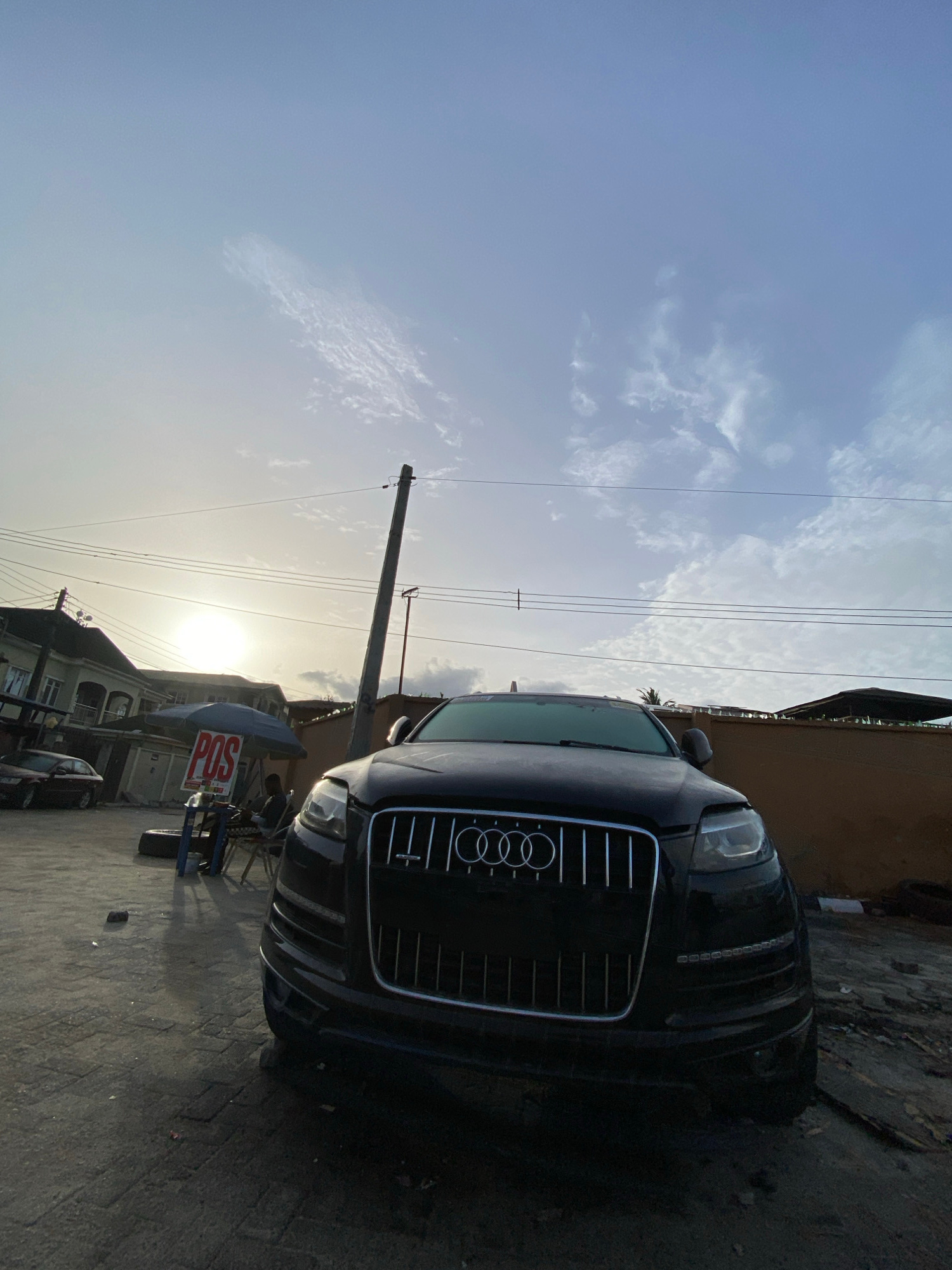 A black Audi Q7 is parked on an urban street in Ado, Nigeria. The sun is low in the sky, casting shadows. A small POS kiosk is visible nearby. Power lines stretch across the sky. Buildings are visible…read more