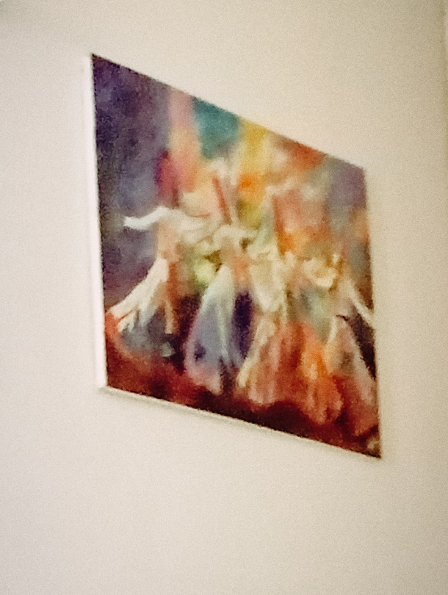 A framed artwork hangs on a neutral-colored wall. The artwork itself appears to be an abstract watercolor or painting with blended hues of purple, red, orange, yellow, green, and white. The subject of…read more