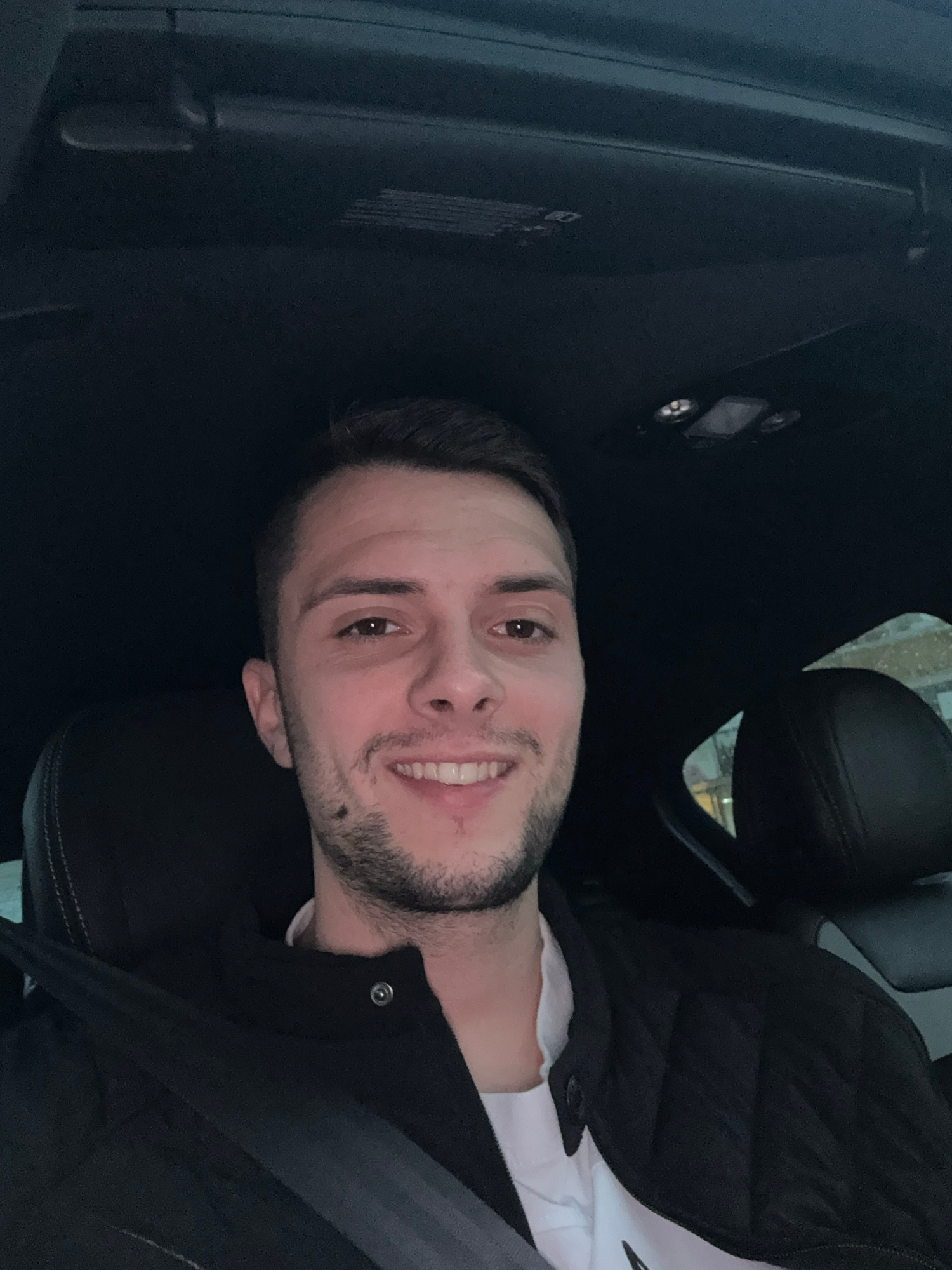 A medium shot depicts a man in a car. The man has dark hair and a trimmed beard. He is smiling. He is wearing a white t-shirt and a black quilted vest or jacket. He appears to be in the driver's seat…read more
