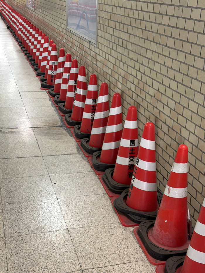 A long row of red and white striped traffic cones stretches into the distance along a tiled wall. The cones are stacked horizontally, their bases touching each other. Japanese text is visible on some…read more