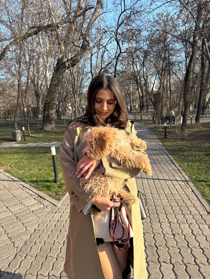The scene depicts a female subject in a park in Yerevan, Armenia. The subject, with long dark hair, is positioned centrally on a paved pathway, looking downwards with a slight smile. She is wearing a…read more