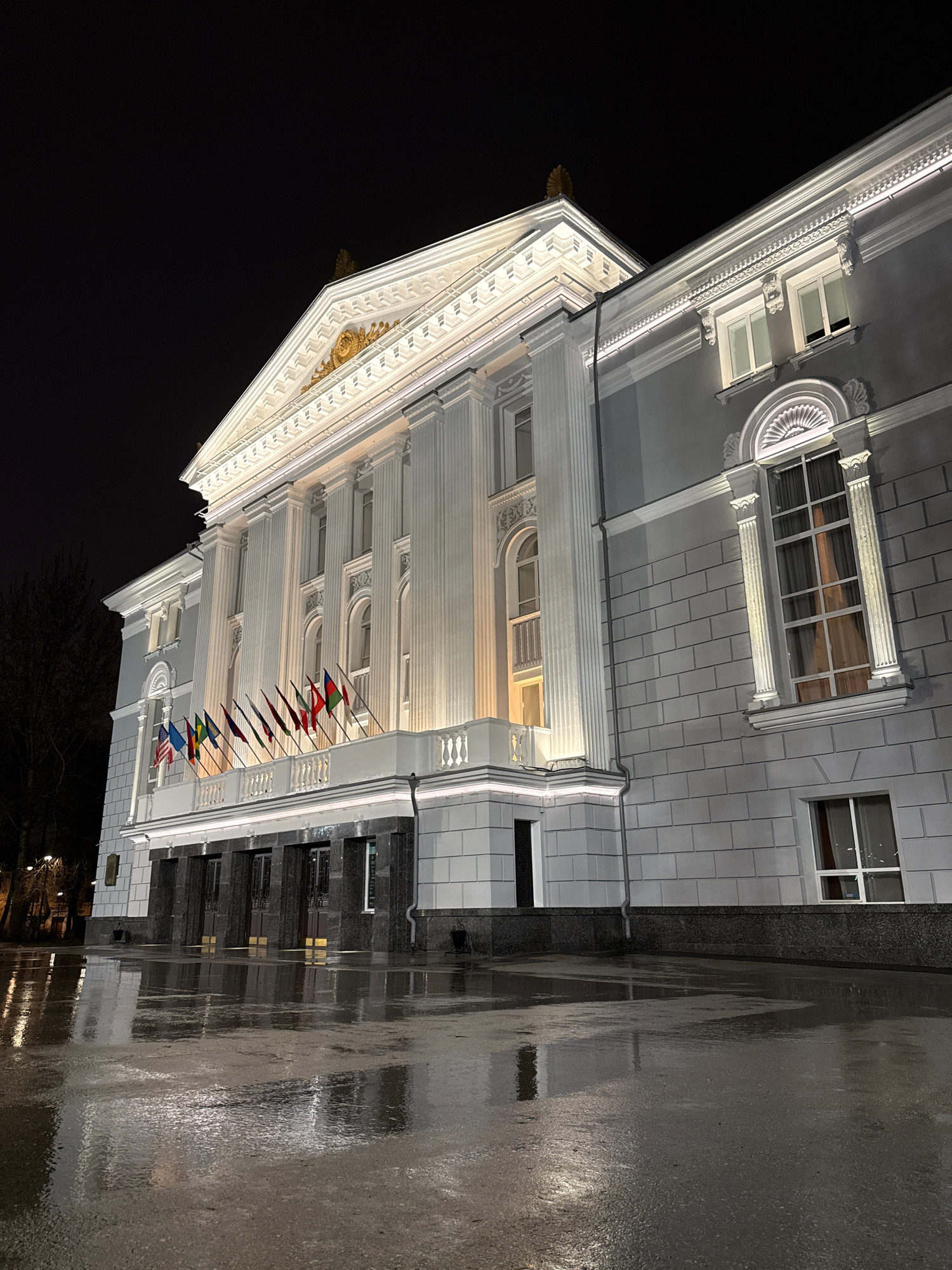 A nighttime photograph captures a building with classical architectural elements, likely located in Perm, Russia. The building is white with prominent columns and decorative trim under the roof. Flags…read more