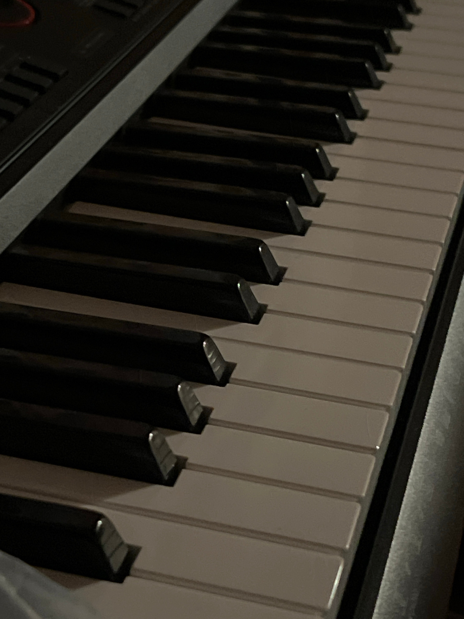 The image shows a close-up of a piano keyboard. The black and white keys are arranged in their standard alternating pattern. The focus is on the keys themselves, obscuring any larger context. There is…read more