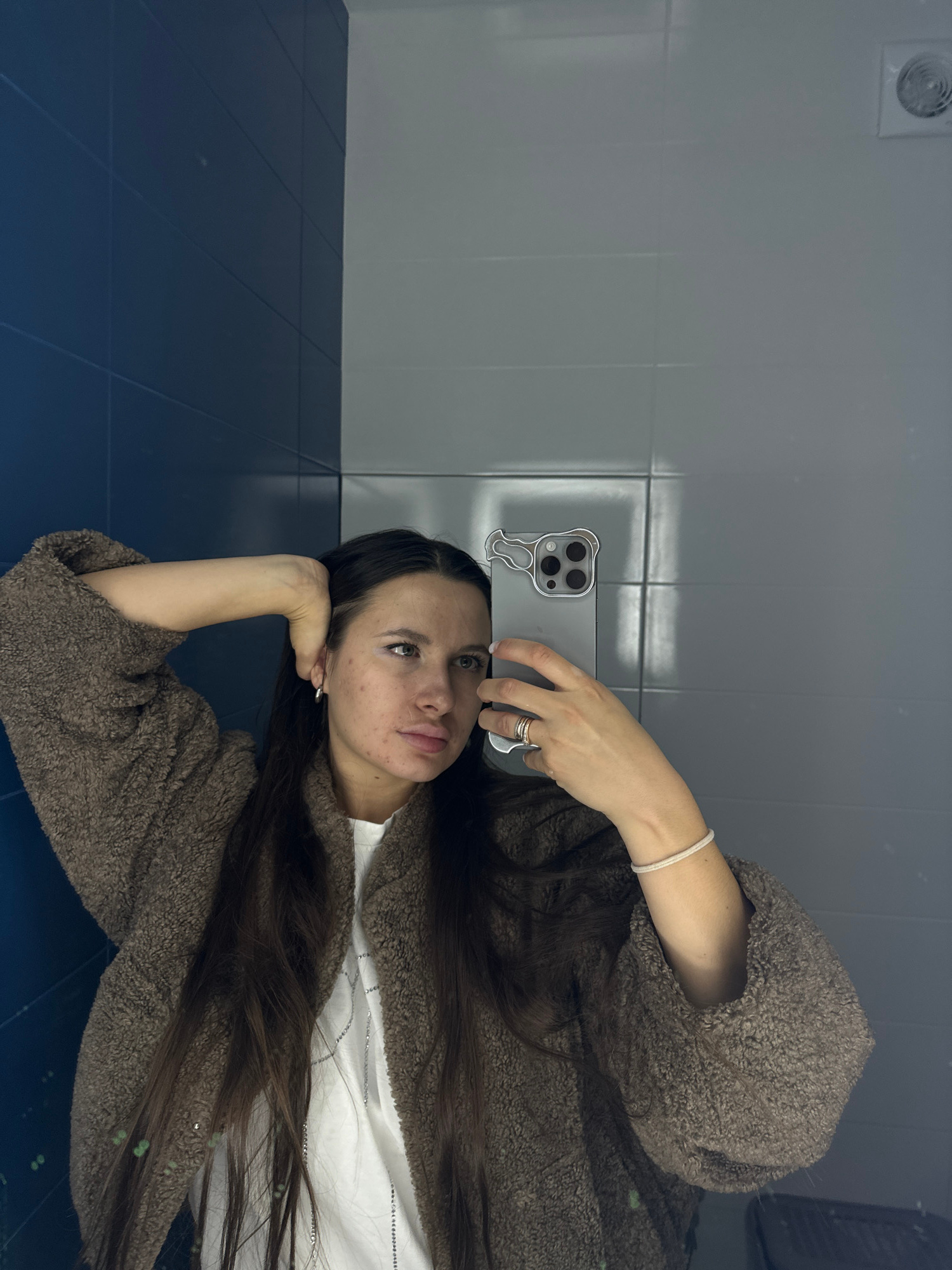 A young woman is lying on a navy blue tiled floor, wearing a brown fluffy jacket and a white t-shirt. She is holding a smartphone in her right hand, presumably taking a selfie. Her long brown hair is…read more