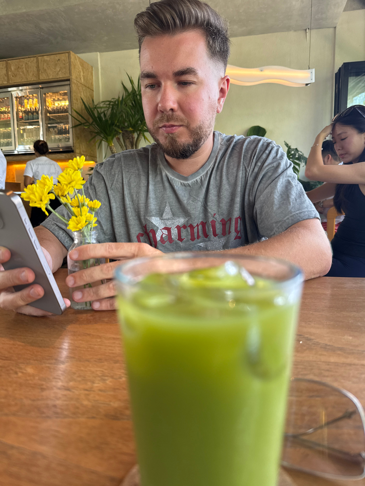 The image, taken indoors, shows a man sitting at a wooden table in what appears to be a restaurant. The table also holds a glass of green liquid, a small vase of yellow flowers, and a smartphone in hi…read more
