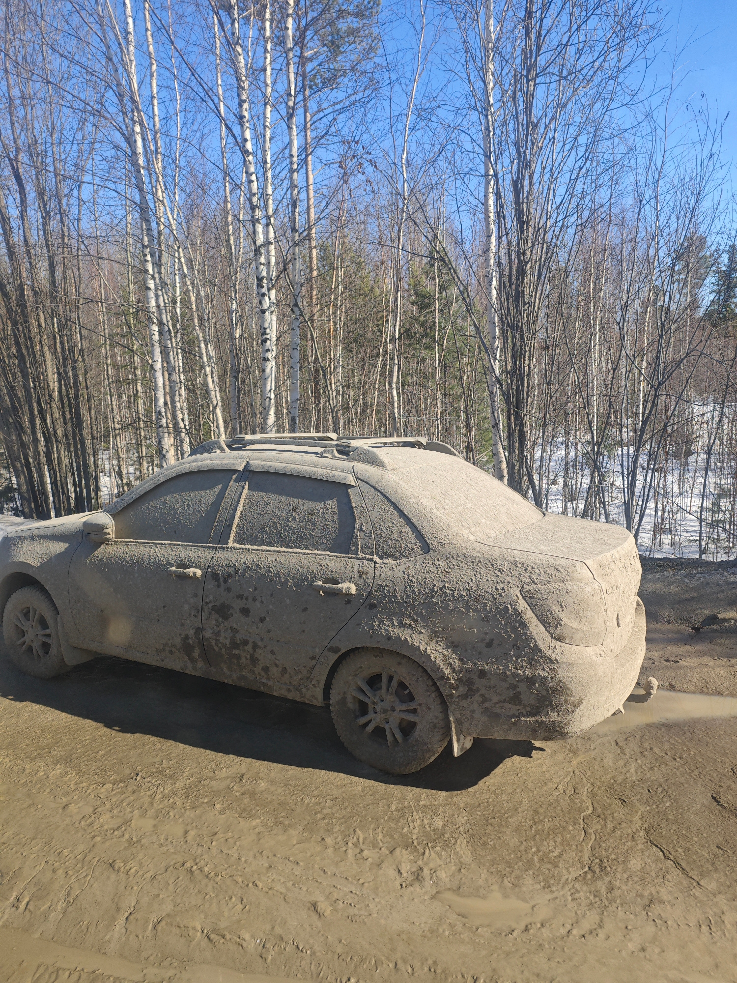 A mud-covered gray car is parked on a muddy road in a forest area. The trees in the background appear to be birch trees and other deciduous trees without leaves, suggesting it is either late autumn or…read more