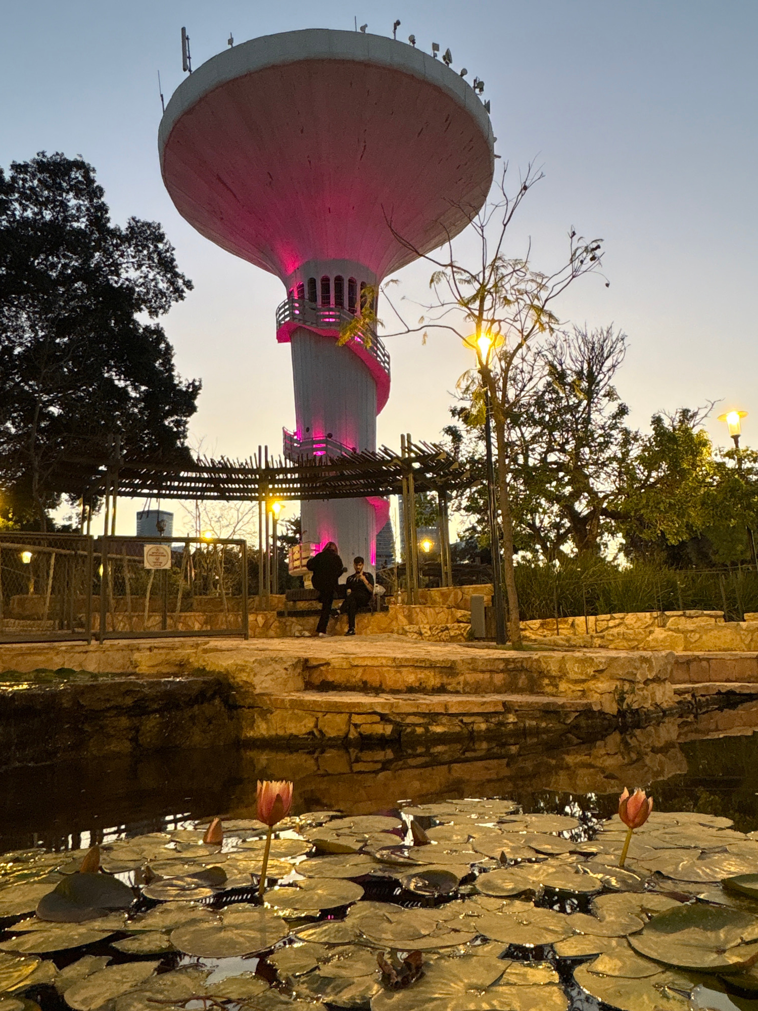 The image shows a view in Ramat Gan, Israel, featuring the city's iconic water tower. The tower, illuminated with pink light, stands prominently against the sky. Trees are visible surrounding the toweβ¦read more