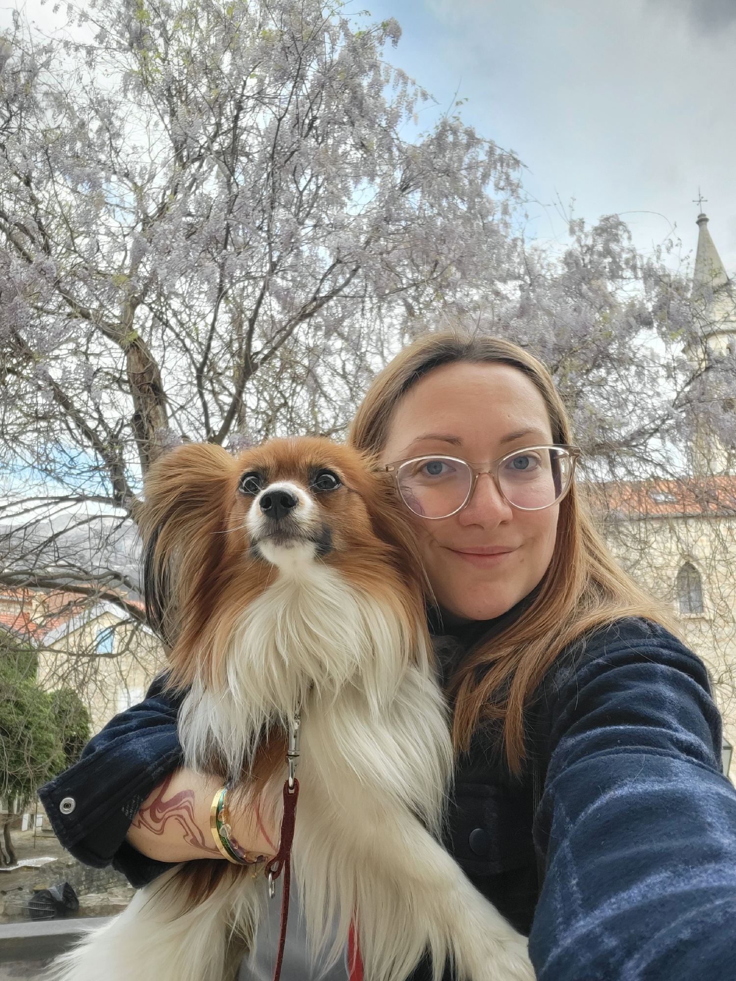 A selfie shows a woman with light brown hair, glasses, and a navy blue jacket holding a Papillon dog with long, flowing white and brown fur. The dog is facing the camera with its head tilted slightly.…read more