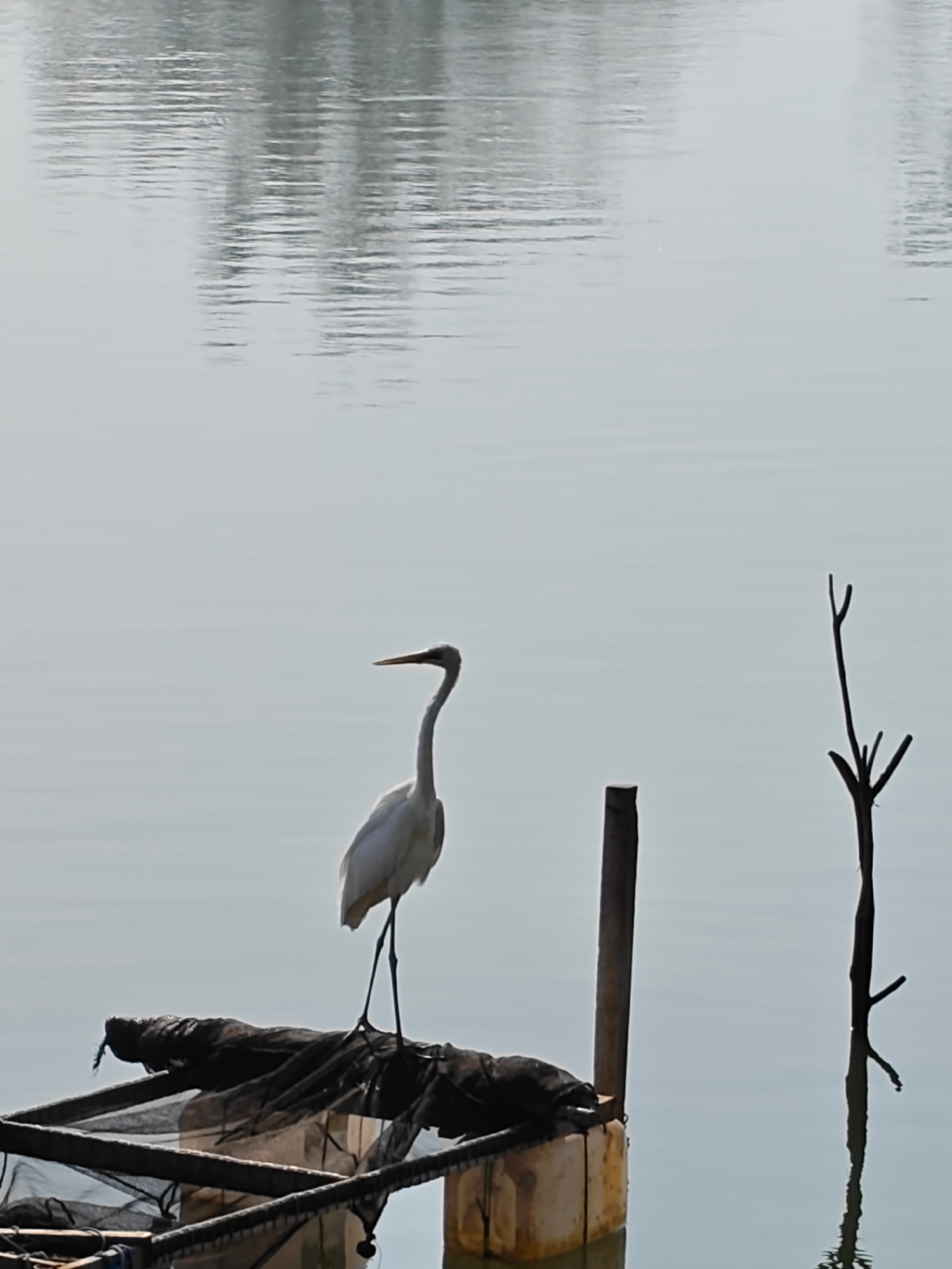 The scene depicts a calm body of water in Lhokseumawe, Indonesia, under diffused lighting conditions. The upper two-thirds of the image show a smooth water surface with subtle ripples and reflections…read more