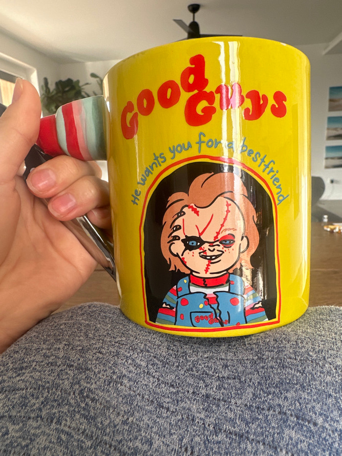 The image displays a close-up, angled view of a person's right hand holding a yellow ceramic mug, observed within an indoor setting in Ericeira, Portugal. The mug, prominent in the foreground, feature…read more