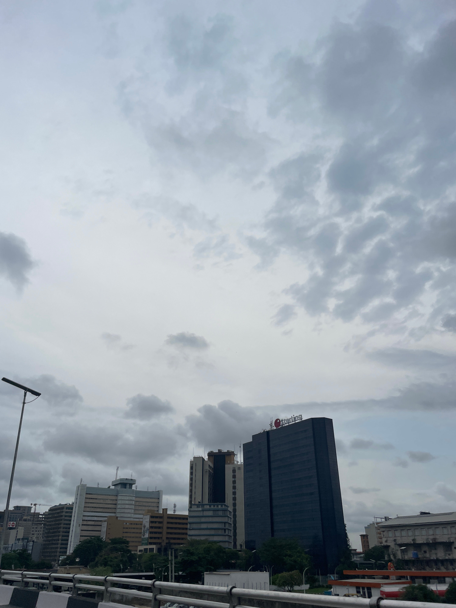 The image shows a cityscape in Lagos, Nigeria under a cloudy sky. Tall buildings dominate the skyline, including one with the "Sterling" logo prominently displayed. A railing suggests the photo was ta…read more