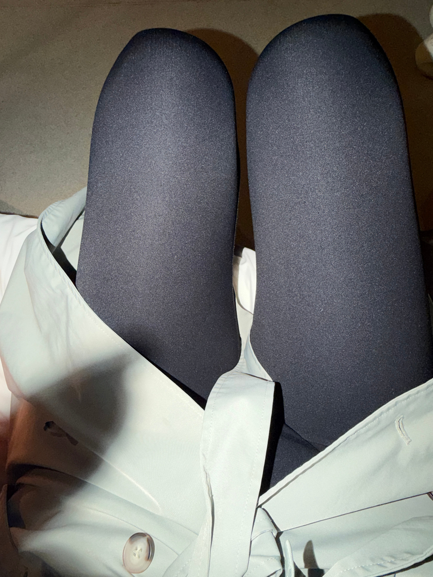 A close-up, high-angle shot depicts a person's legs clad in dark leggings, with a light-colored trench coat draped over them. The coat features a button closure and a belt cinched at the waist. The ba…read more