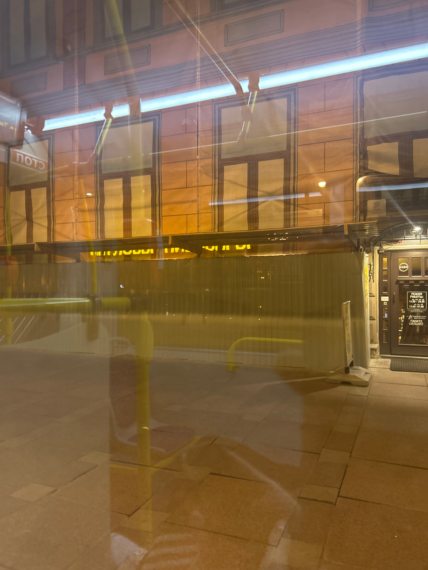 The image, taken at night, captures a street scene through a reflective window, likely from inside a public transport vehicle. The heavy reflections of the interior lights and structures overlay the v…read more