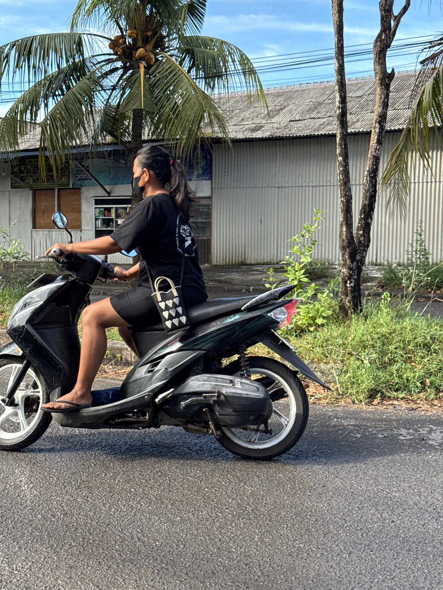 A medium outdoor shot depicts an individual on a black scooter on an asphalt road in Kuta Selatan, Indonesia. The person, with dark hair pulled back, is wearing a black t-shirt, black shorts, and flip…read more