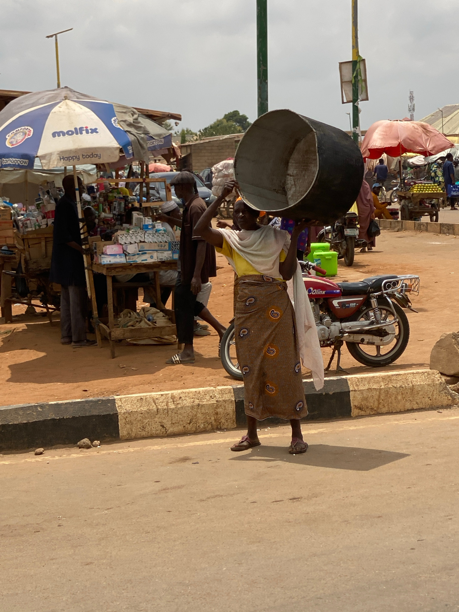 The image captures a vibrant street scene in Kafanchan B, Nigeria, during what appears to be a sunny day, evidenced by strong shadows. In the foreground, a person, likely a woman, is centered, carryin…read more