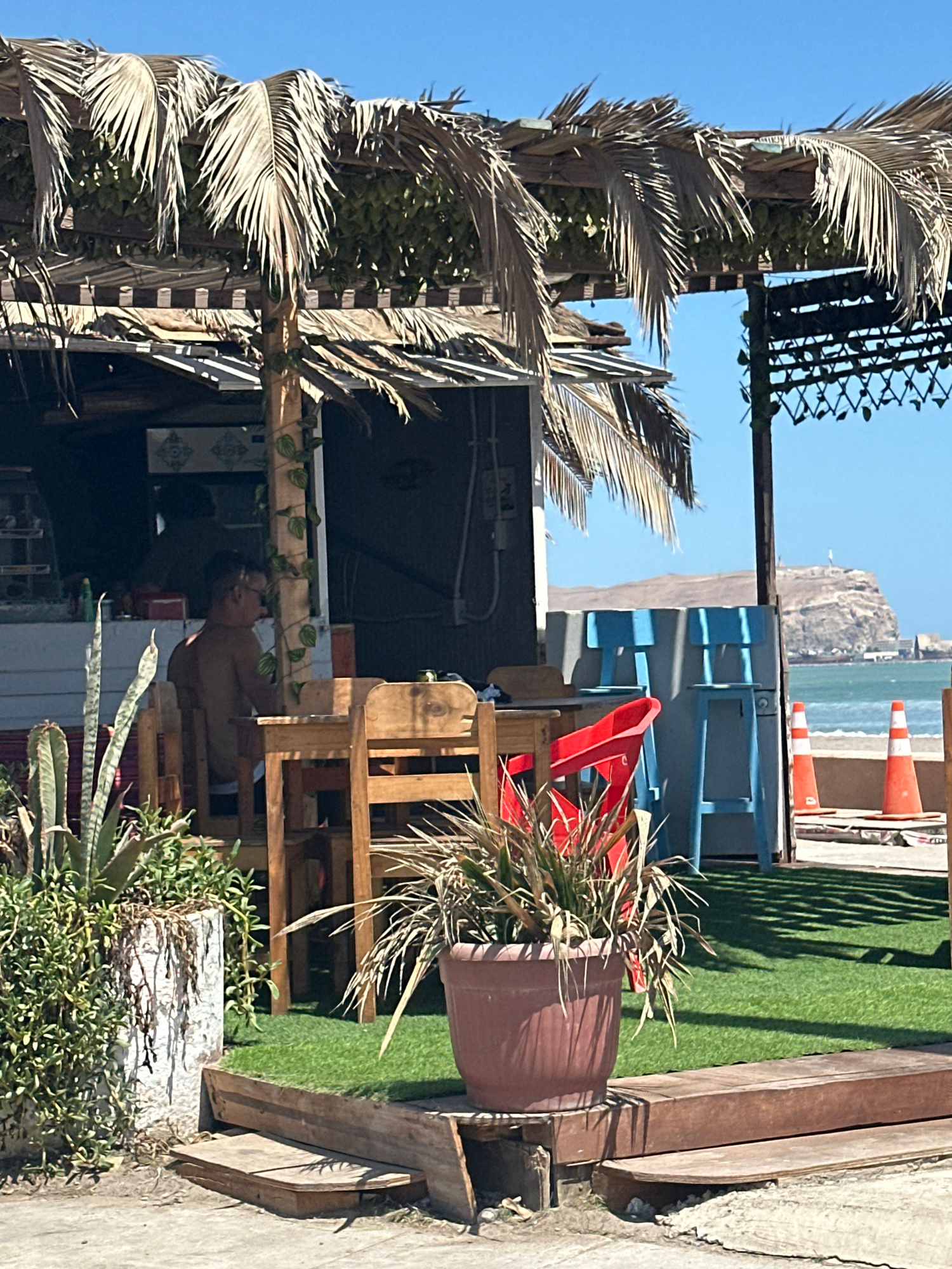 The image depicts an outdoor scene in Arica, Chile, likely near the coast. The primary focus is a semi-open structure, possibly a beach bar or cafe, featuring a wooden frame partially adorned with dri…read more