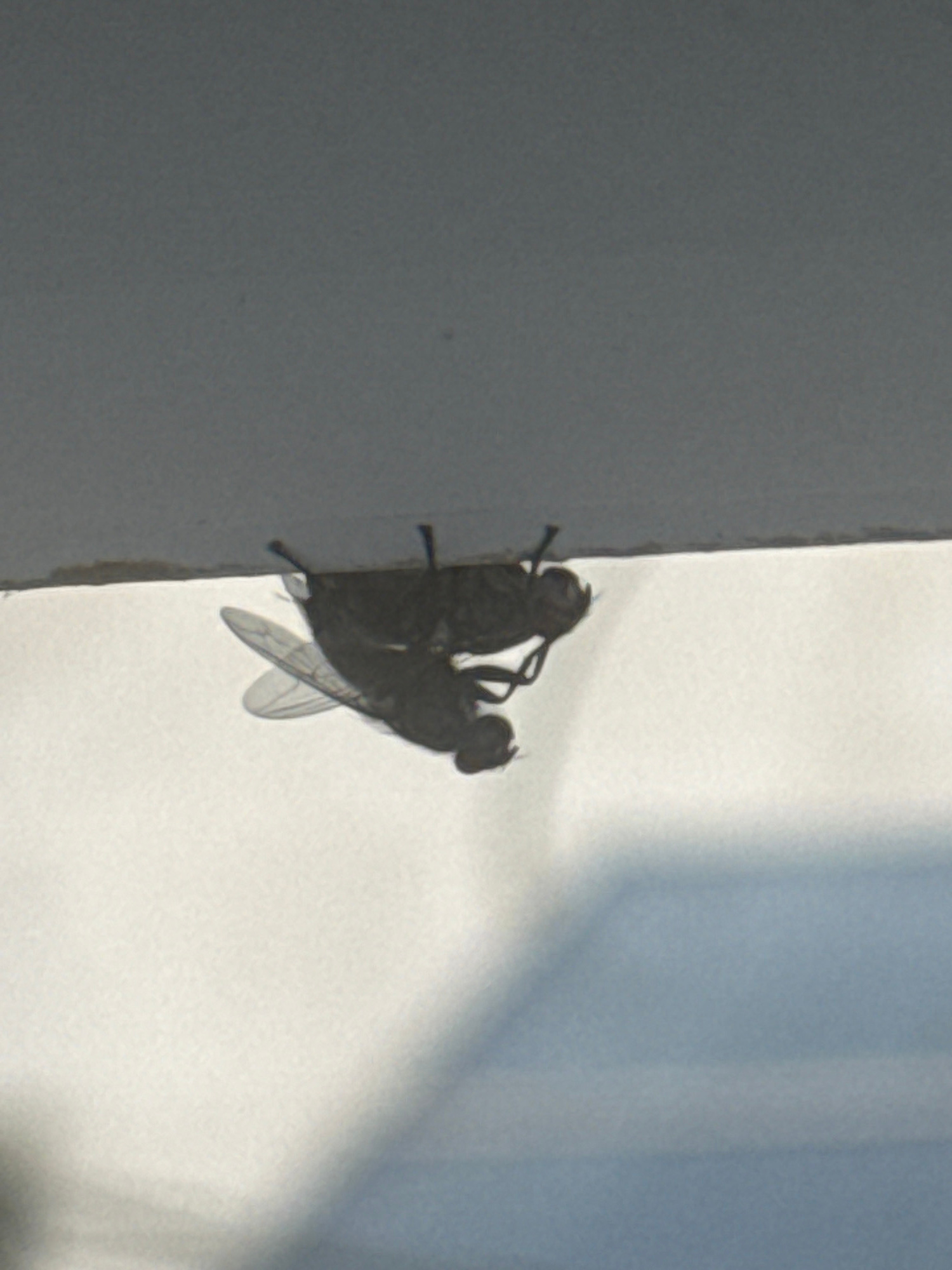 In Bat Yam, Israel, two flies are positioned on a pale, vertical surface next to a brightly lit area. The flies are dark in color, with visible wings and legs. The background is a light color with a h…read more