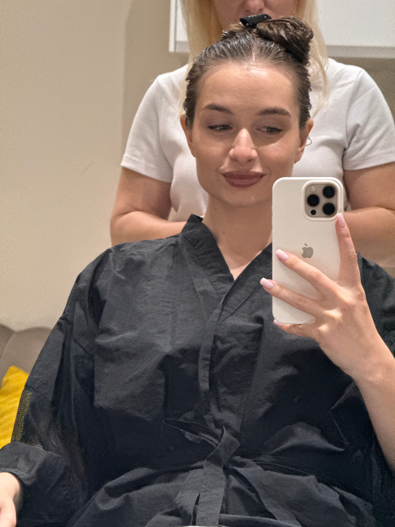 A light-skinned person with dark hair pulled back in a bun, wearing a white t-shirt, is taking a selfie with a white iPhone in front of a second person. The person taking the selfie is wearing a black…read more