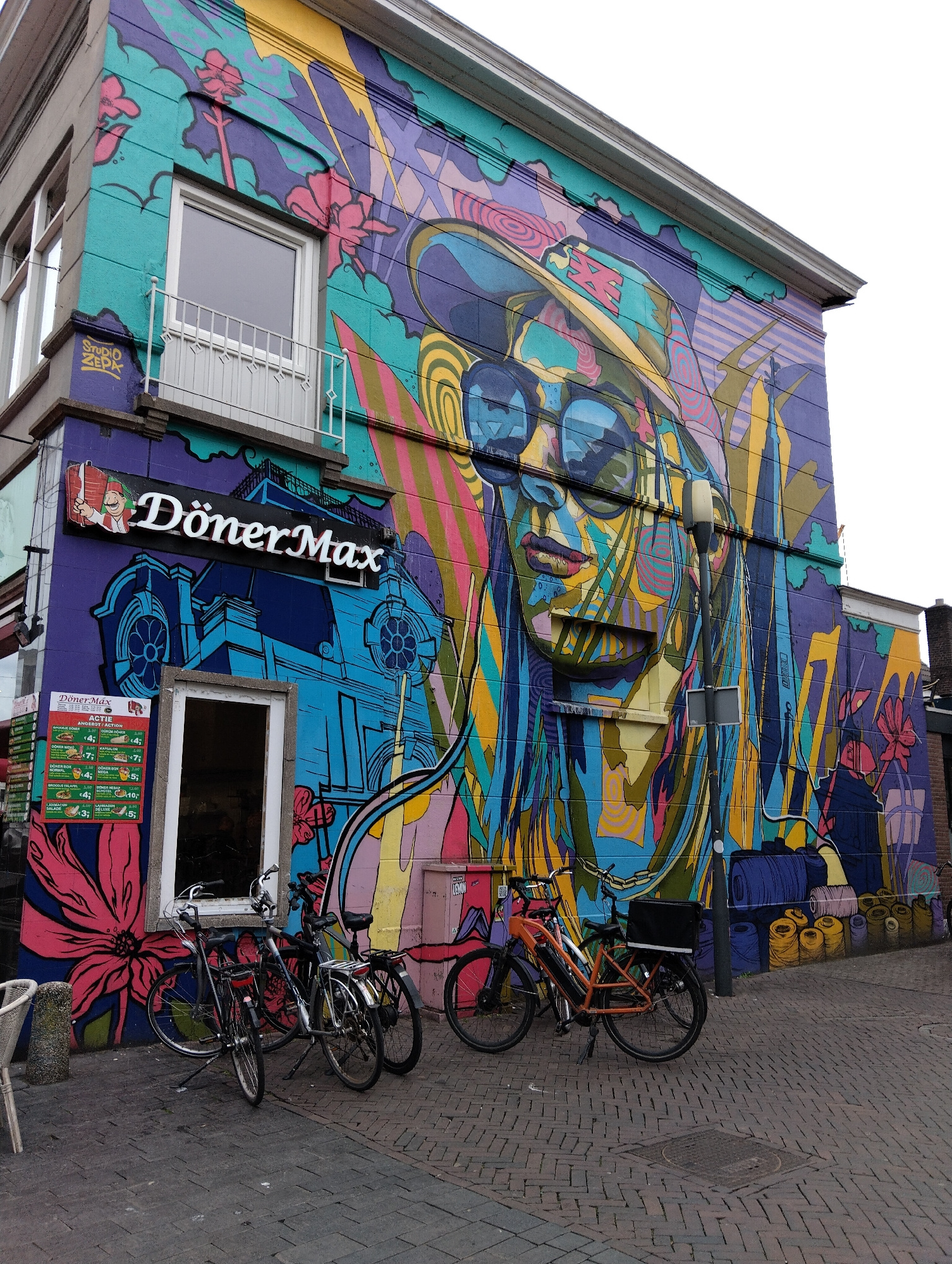 The image captures the exterior of a "Döner Max" establishment in Enschede, Netherlands. The building's façade is adorned with vibrant and intricate street art depicting a stylized portrait of a perso…read more