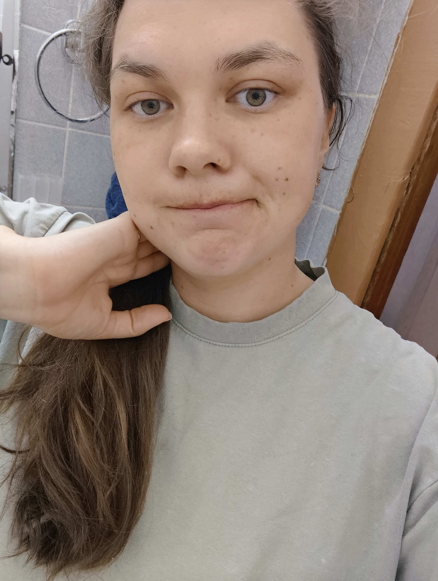 A selfie taken indoors, possibly in a bathroom. A woman with fair skin, light brown hair pulled back, and green eyes is the central subject. She wears a light green t-shirt. Her hand is raised to her…read more