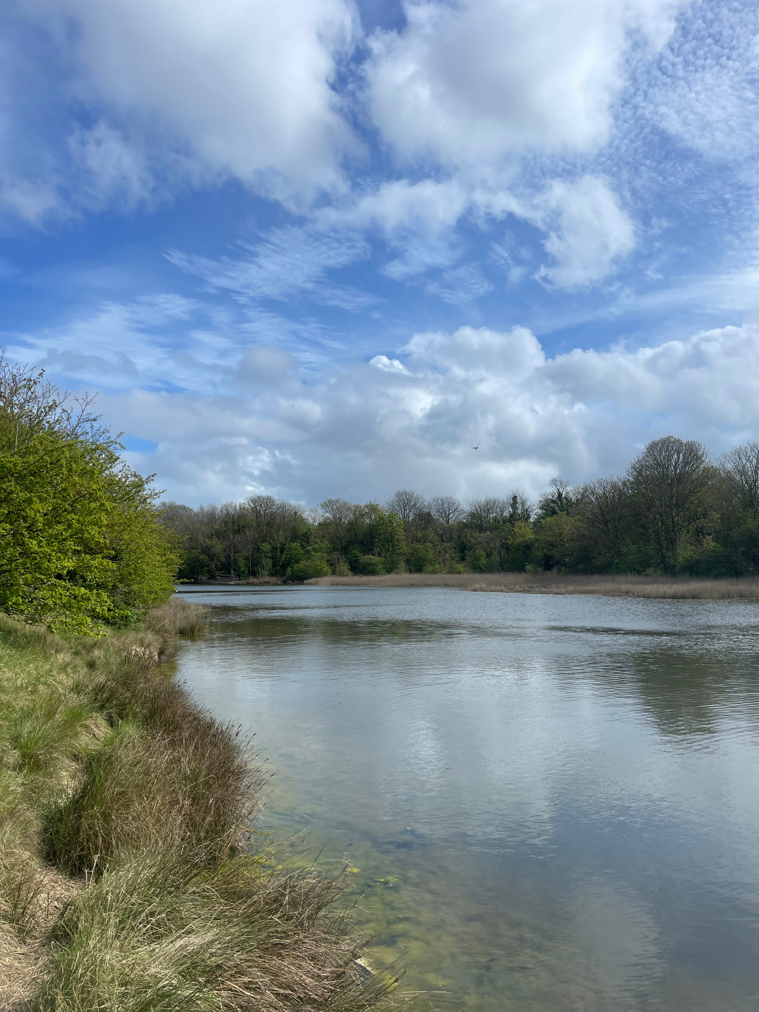 This image captures a serene natural landscape, likely an estuary or a wide river in the Portsmouth, United Kingdom area, under a bright, partly cloudy sky. The scene is split between a tranquil body…read more