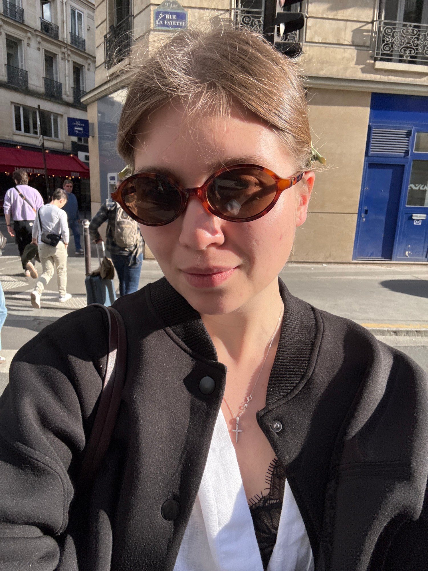 A close-up, tilted selfie captures a young woman outdoors on a sunny day in Paris, France. She is wearing brown-framed, dark-lensed sunglasses, a black bomber-style jacket with ribbed cuffs, and a whi…read more