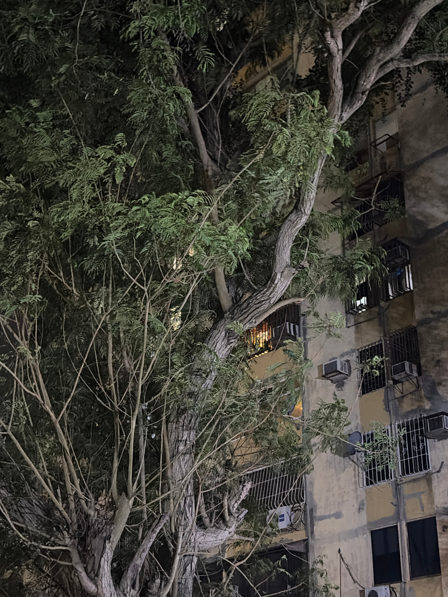 This nighttime image depicts an urban scene in Ciudad Guayana, Venezuela, focusing on a large, mature tree obscuring a portion of a multi-story residential building. The tree, characterized by a thickโฆread more
