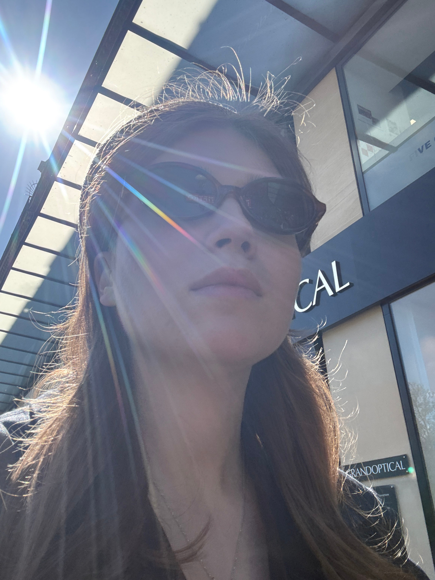 A woman is pictured in an upward angle selfie, wearing sunglasses. The background shows an outdoor environment with a commercial storefront. The sign reads "OPTICAL" and "GRAND OPTICAL." The environme…read more