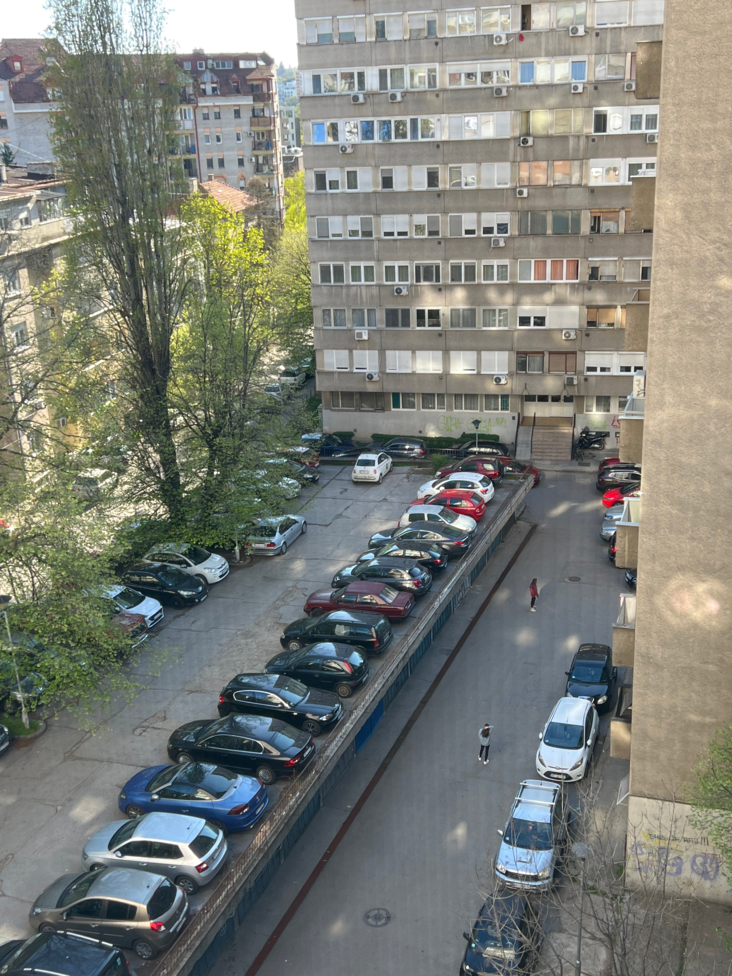 An overhead shot reveals a cityscape in Belgrade, Serbia. In the foreground, a large, pale apartment building with numerous rectangular windows and air conditioning units jutting out. A line of parkedβ¦read more