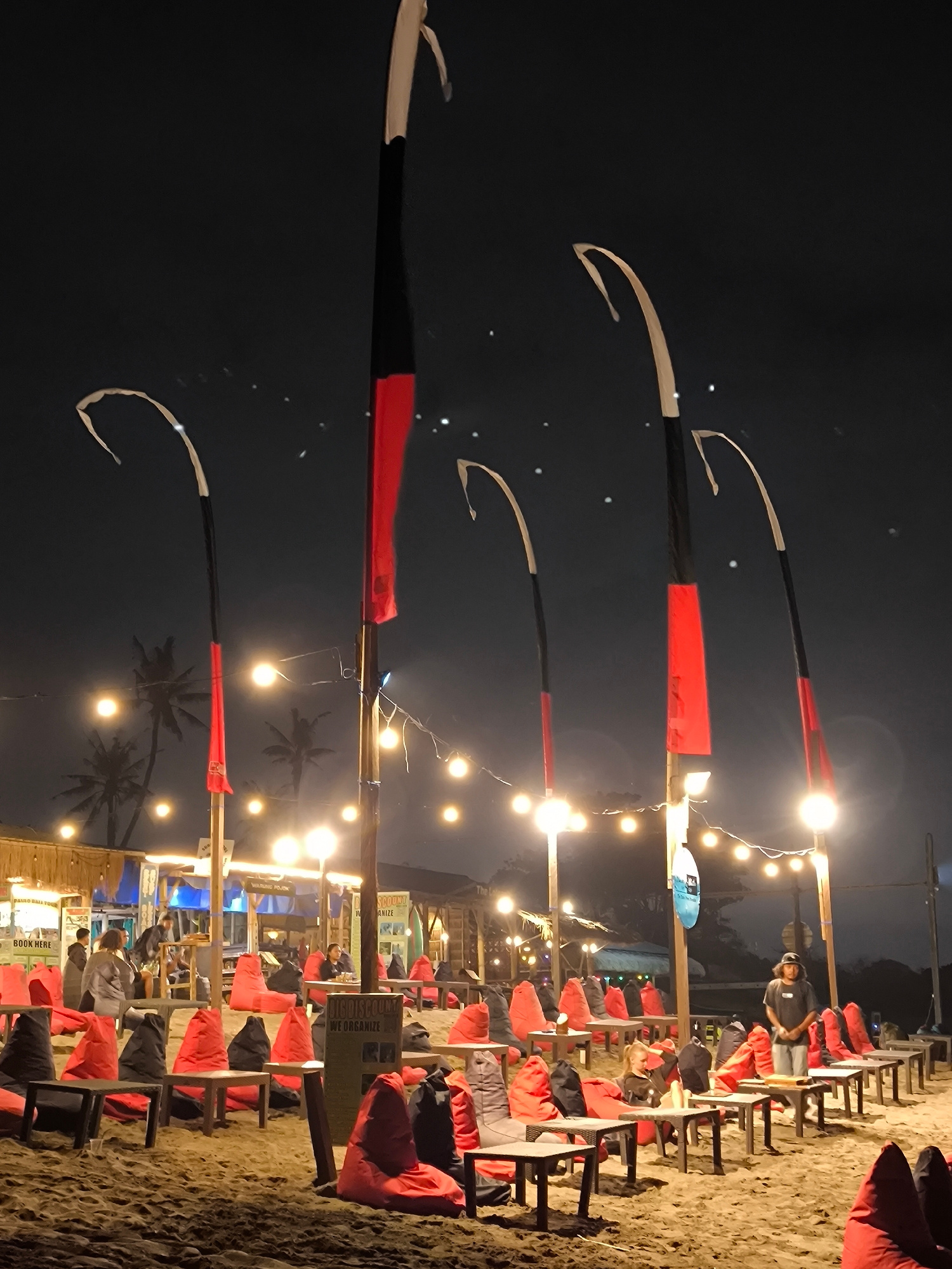 The image depicts an outdoor beach lounge at night in Canggu, Indonesia. Several tall, decorative poles with curved tops are spaced along the sandy beach. Each pole has a segment of red and black fabr…read more