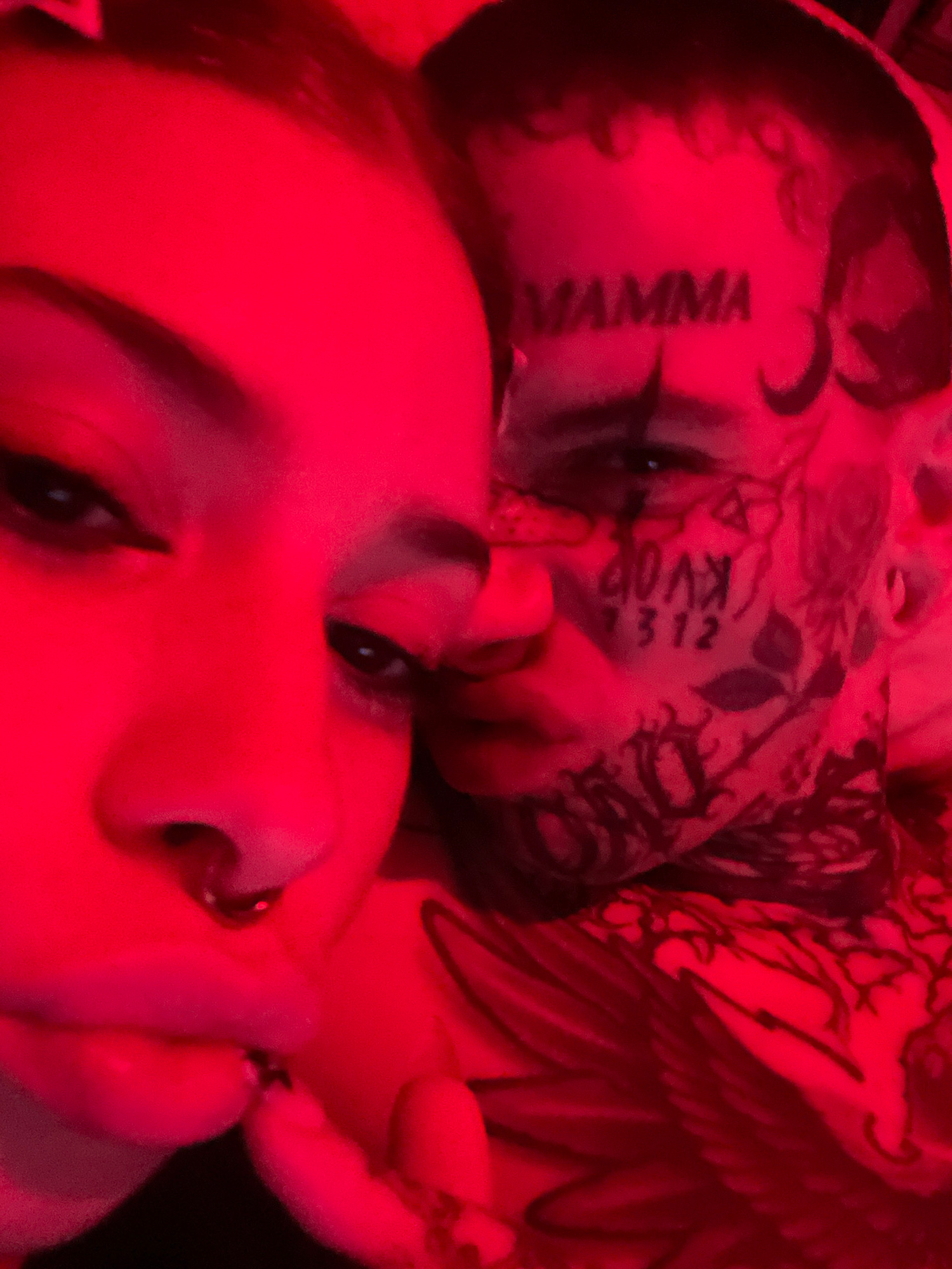 Two individuals are visible in a close-up shot, illuminated by a strong red light. The person in the foreground, likely female, has fair skin and dark eyes, and a nose piercing. The second person, pos…read more