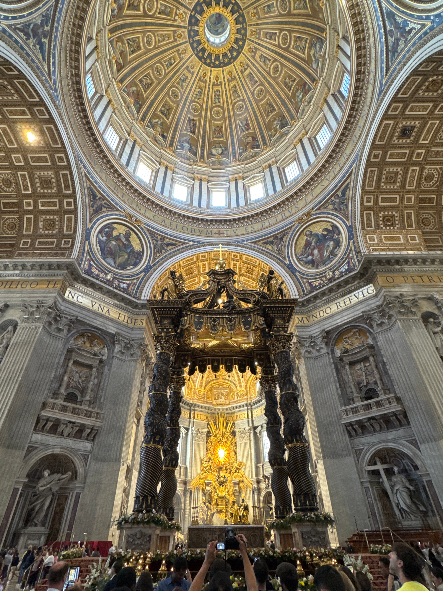 Here is a detailed description of the image: The image captures the interior of St. Peter's Basilica, located in Vatican City. It presents an upward view showcasing the basilica's architectural grand…read more