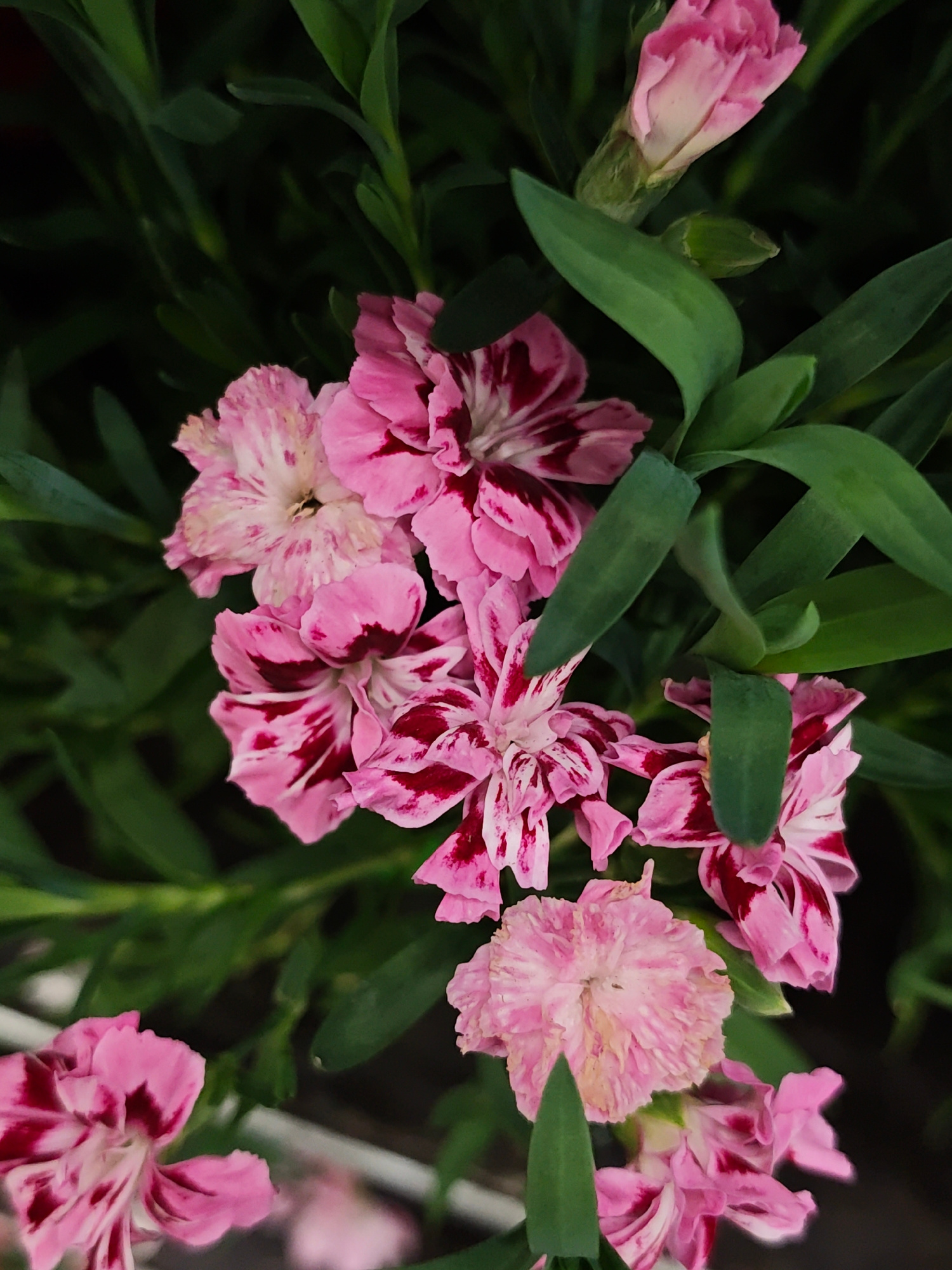 The image shows a close-up of pink and burgundy carnation flowers surrounded by green foliage. The flowers display a mix of open blooms and buds, with some showing a striped pattern. The background isβ¦read more