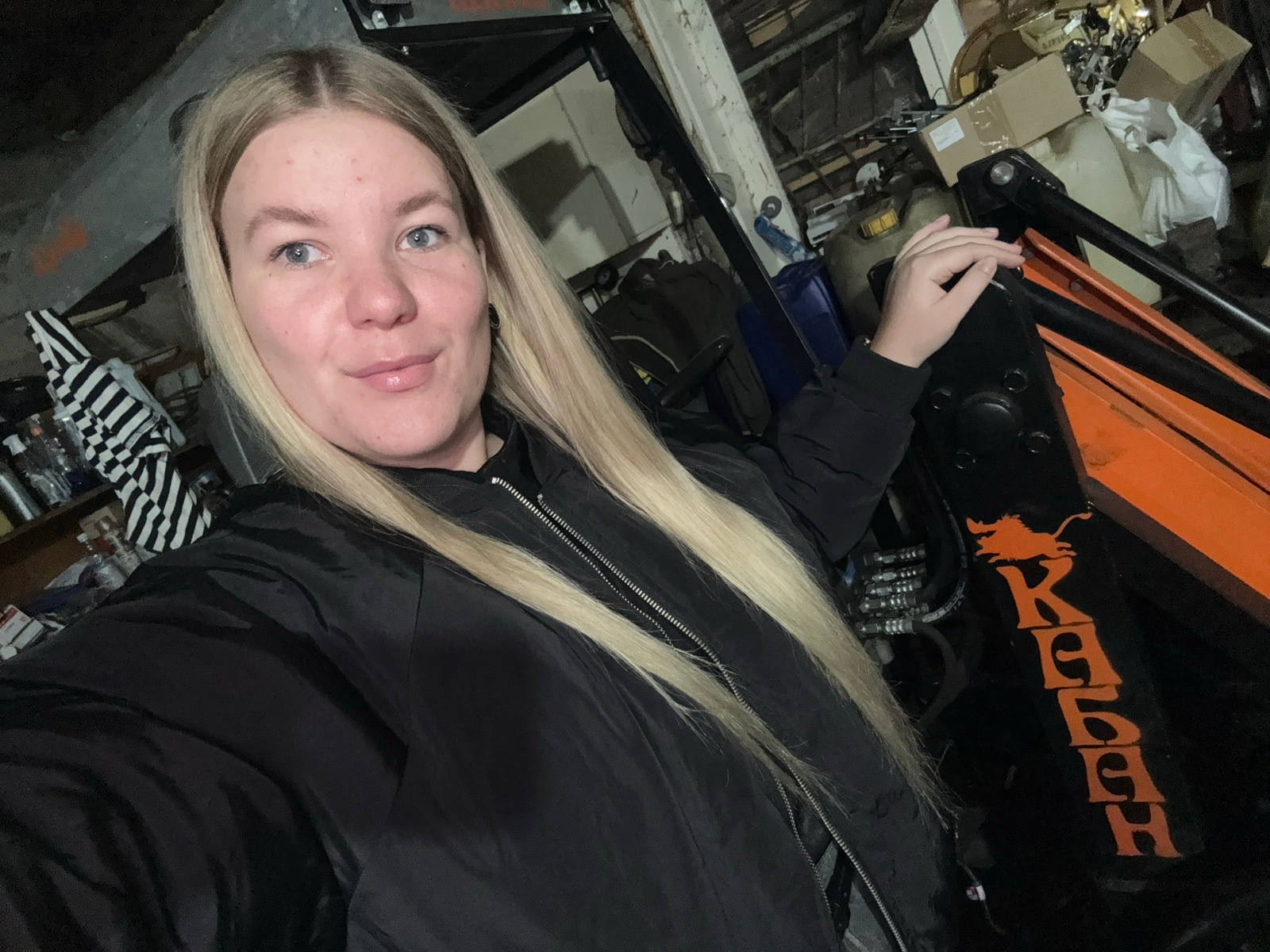 A person with long blonde hair, wearing a black jacket, is partially visible in a cluttered indoor location. Adjacent to the person is an orange and black machine with the word "KALEKH" printed vertic…read more