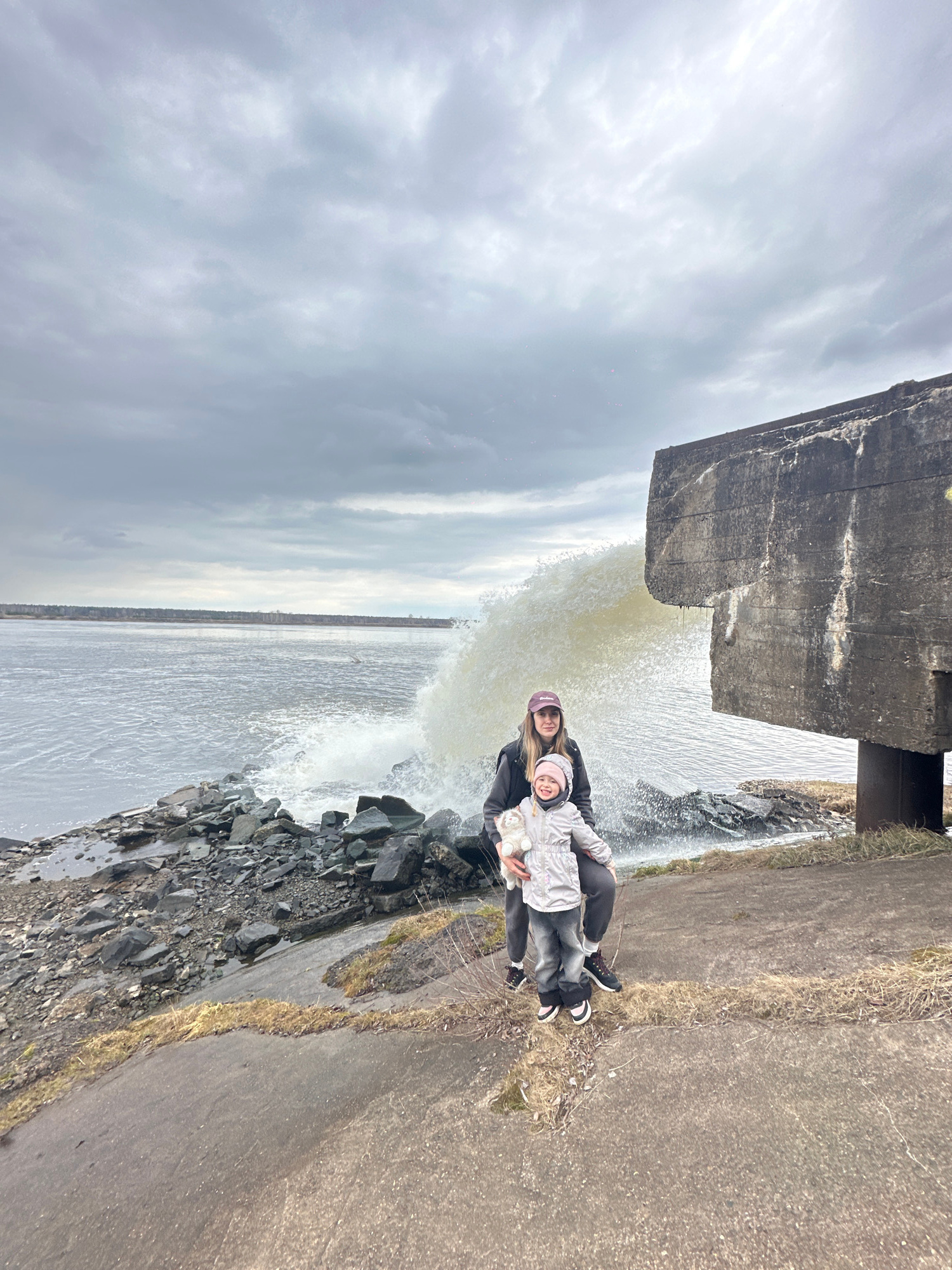A mother and child stand next to a body of water, likely a river or reservoir, next to what appears to be a concrete structure with water flowing from it. The location is Chaikovsky, Russia, as indica…read more