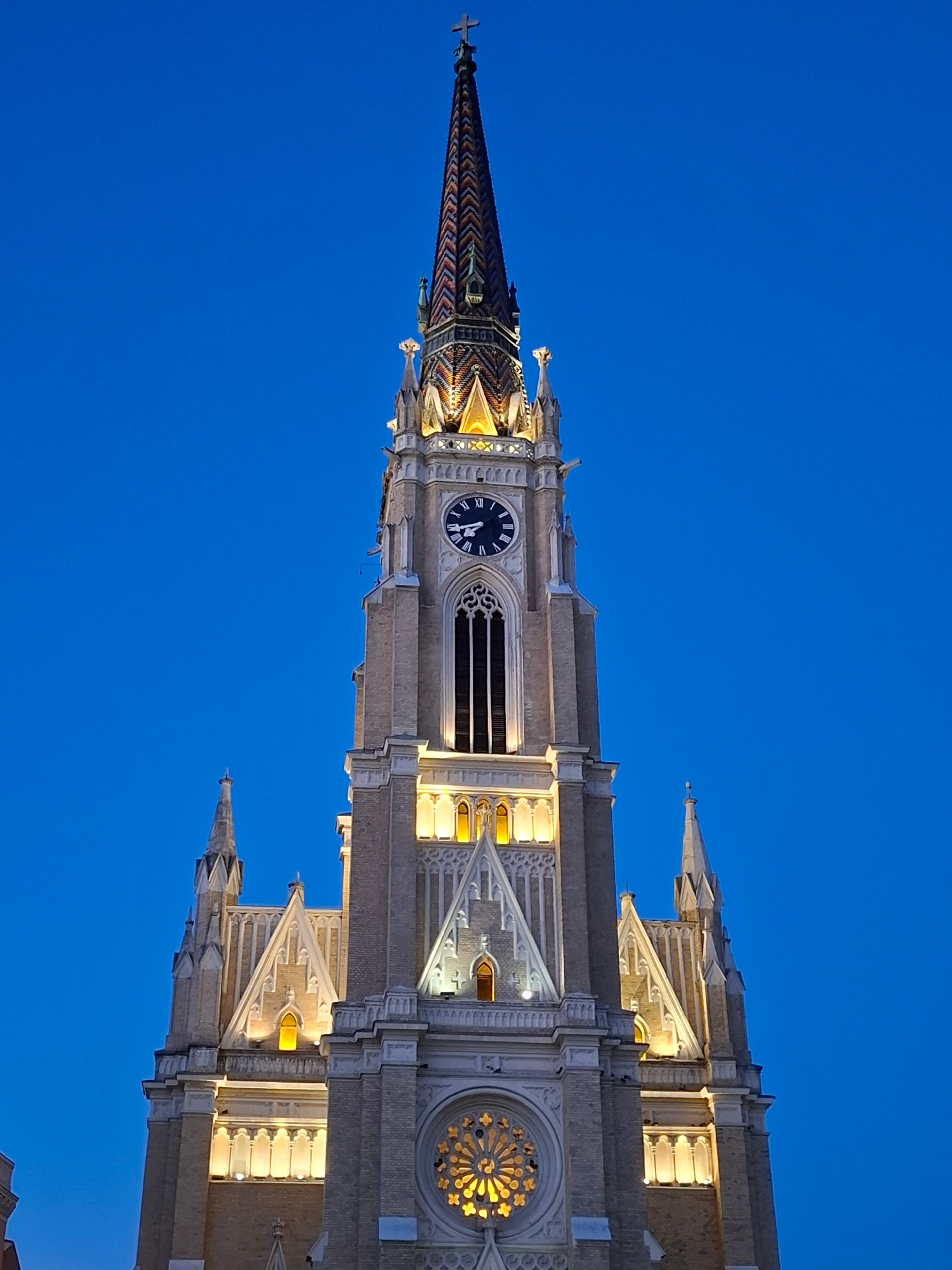 The image depicts the Church of the Name of Mary in Novi Sad, Serbia, taken at dusk or night. The Neo-Gothic church's illuminated steeple is the focal point against a dark blue sky. The steeple featurβ¦read more