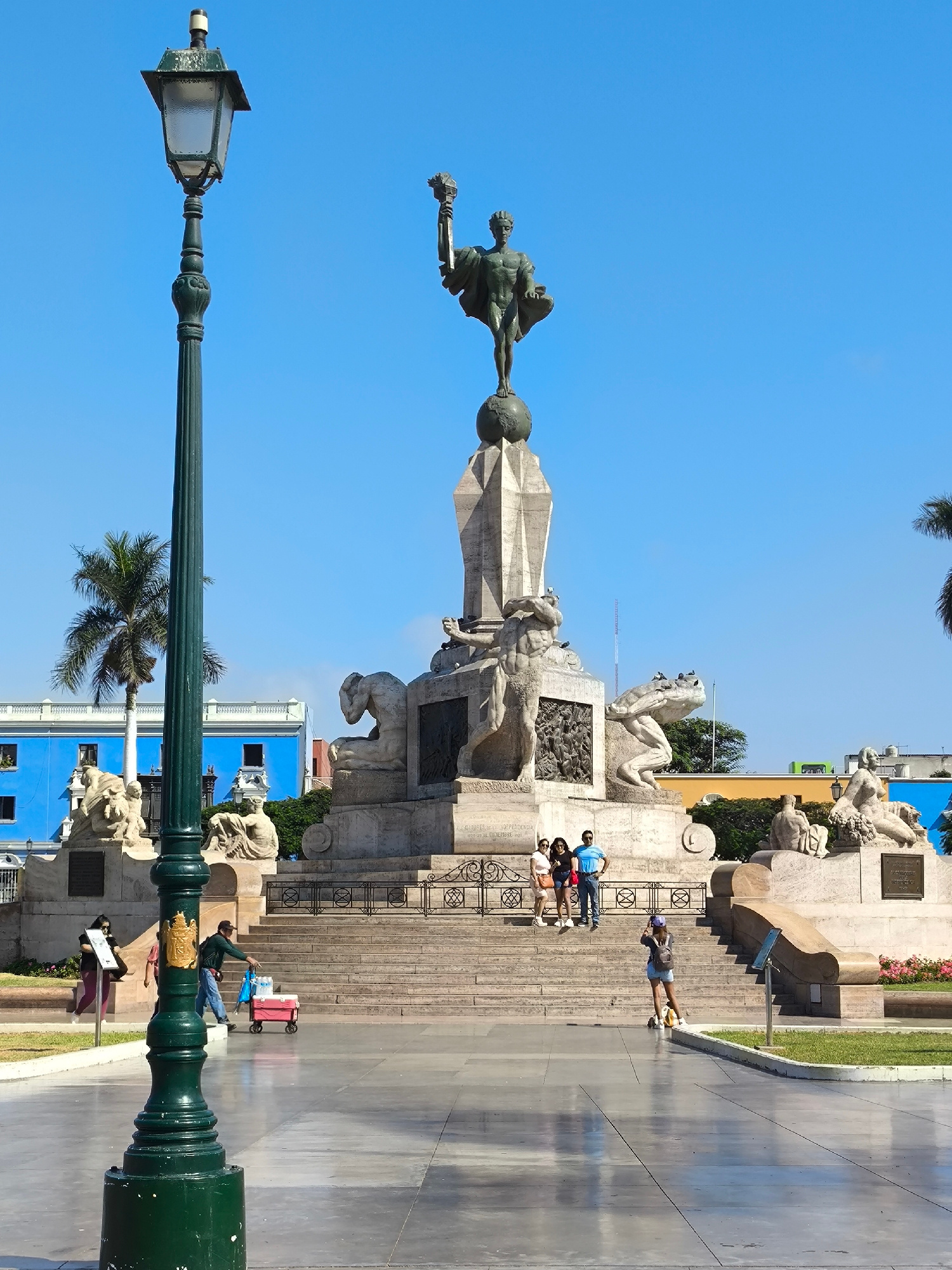 The image shows the Plaza de Armas (main square) in Trujillo, Peru, dominated by the Monument to Liberty. The monument features a tall central pedestal with a statue of a naked male figure standing at…read more