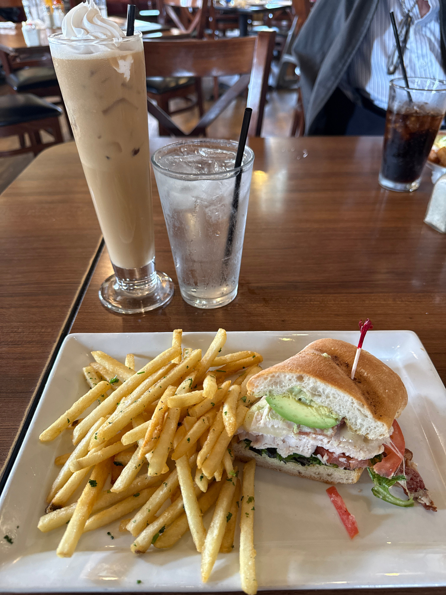 The image shows a meal on a wooden table. The meal consists of a sandwich with avocado, lettuce, tomato, and bacon, accompanied by a portion of French fries. A tall glass of iced coffee with whipped c…read more