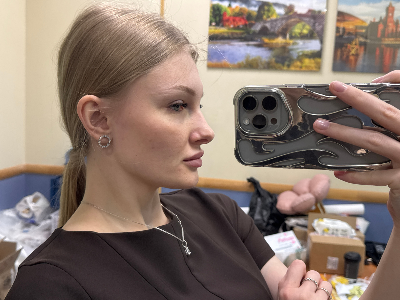 A woman takes a selfie. She is fair-skinned with blonde hair pulled back in a ponytail. She is wearing round stud earrings, a silver necklace with a teardrop pendant, a dark brown dress, and a ring. H…read more