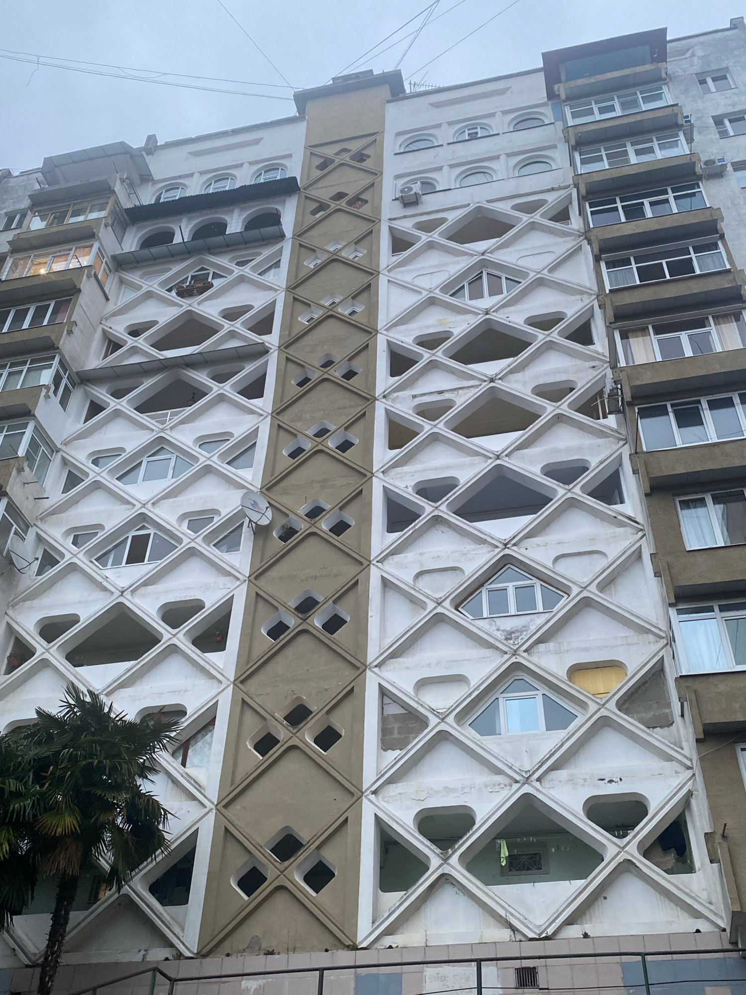 The image shows a tall building in Sochi, Russia, characterized by a repeating diamond-shaped facade. The facade is predominantly white, with a central band of gray diamonds. Some of the diamond shape…read more