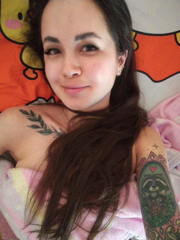 The scene depicts a young adult female reclining indoors in the city of Noviy, Russia. She has long, dark brown hair falling over her right shoulder and chest, and is looking directly at the camera wiβ¦read more