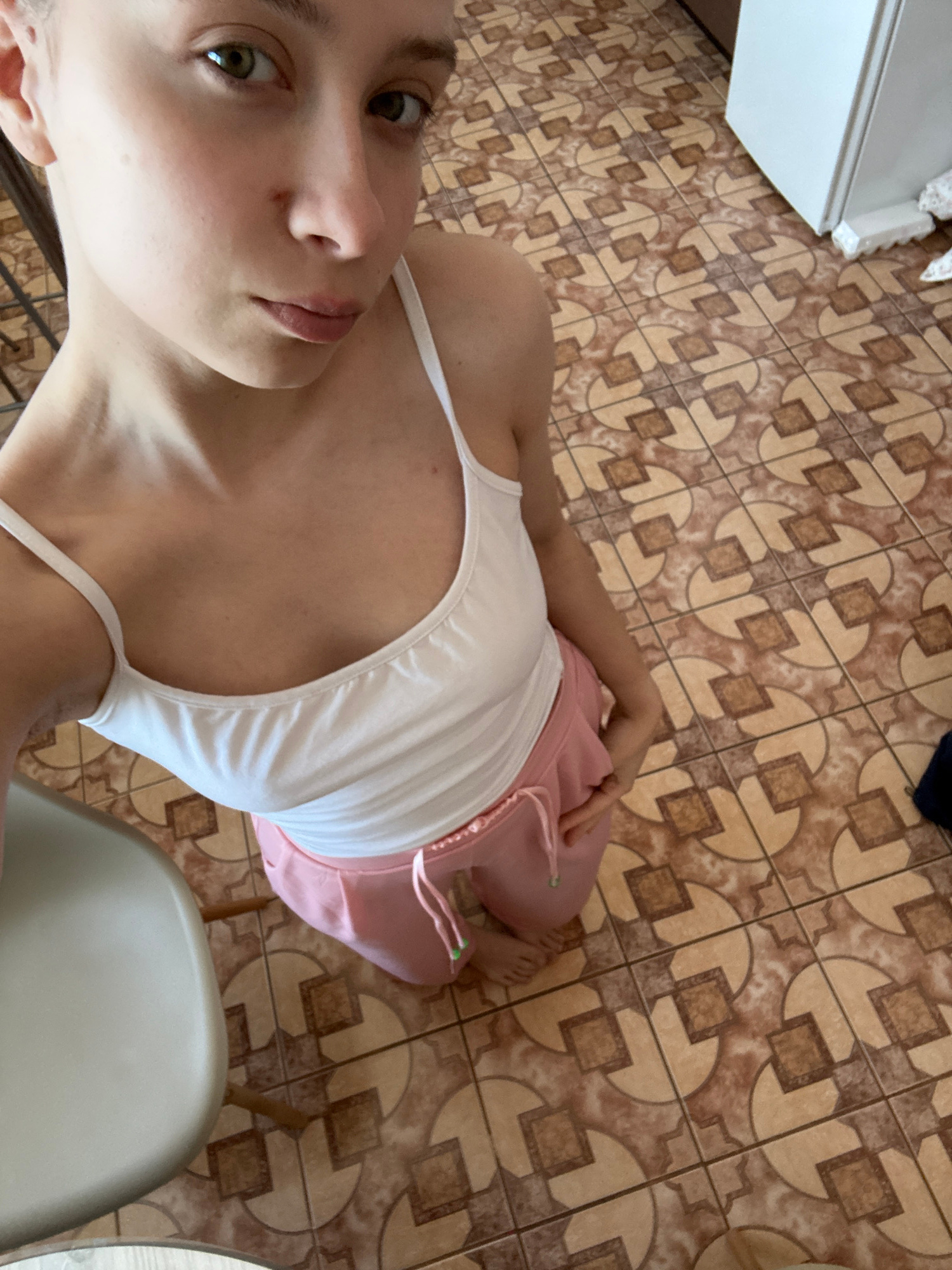 A young individual with fair skin and green eyes is shown in a close-up, angled shot. They are wearing a white tank top and pink bottoms. The location appears to be indoors, as suggested by the tiled…read more