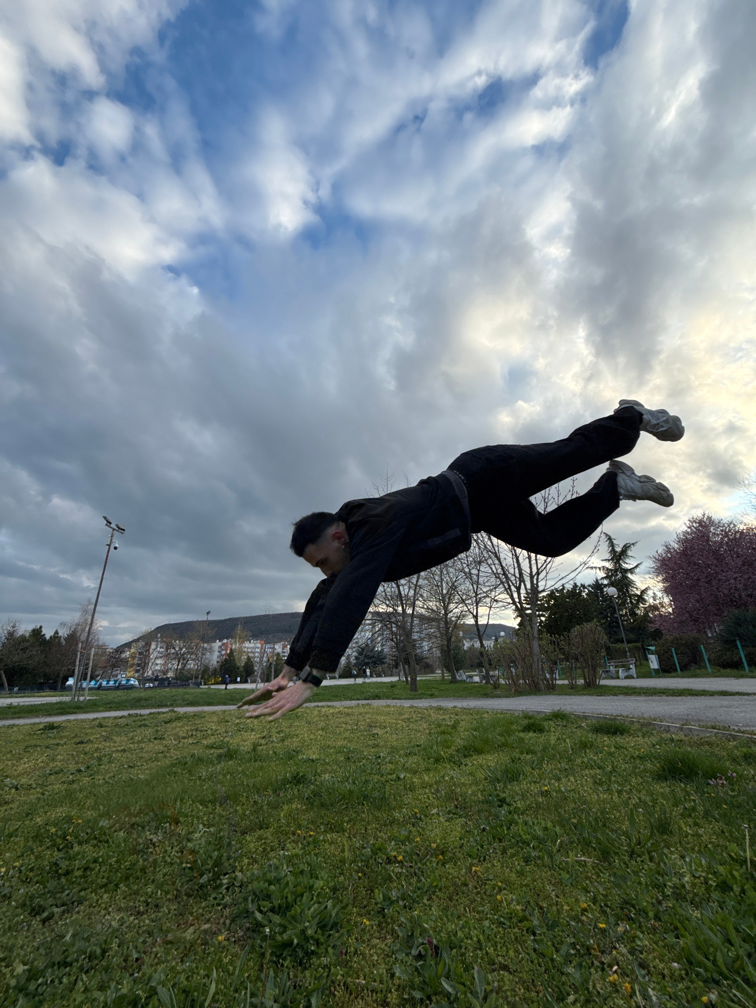 A person is performing a backflip on a grassy field in Shumen, Bulgaria. The person is wearing black pants, grey shoes, and a black jacket. The sky is cloudy. In the background, there is a city with b…read more