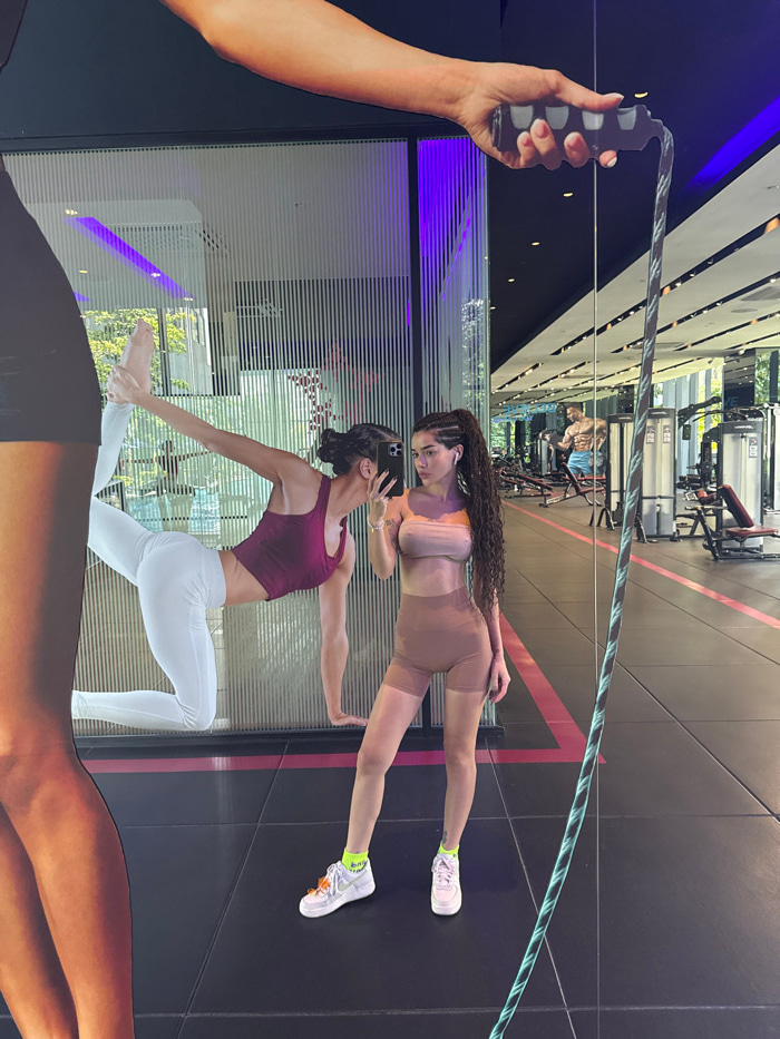 This image depicts a mirror selfie taken by a woman inside a modern fitness facility, specifically identified as a gym in Kuala Lumpur, Malaysia. In the foreground, a young woman with long, dark, cur…read more